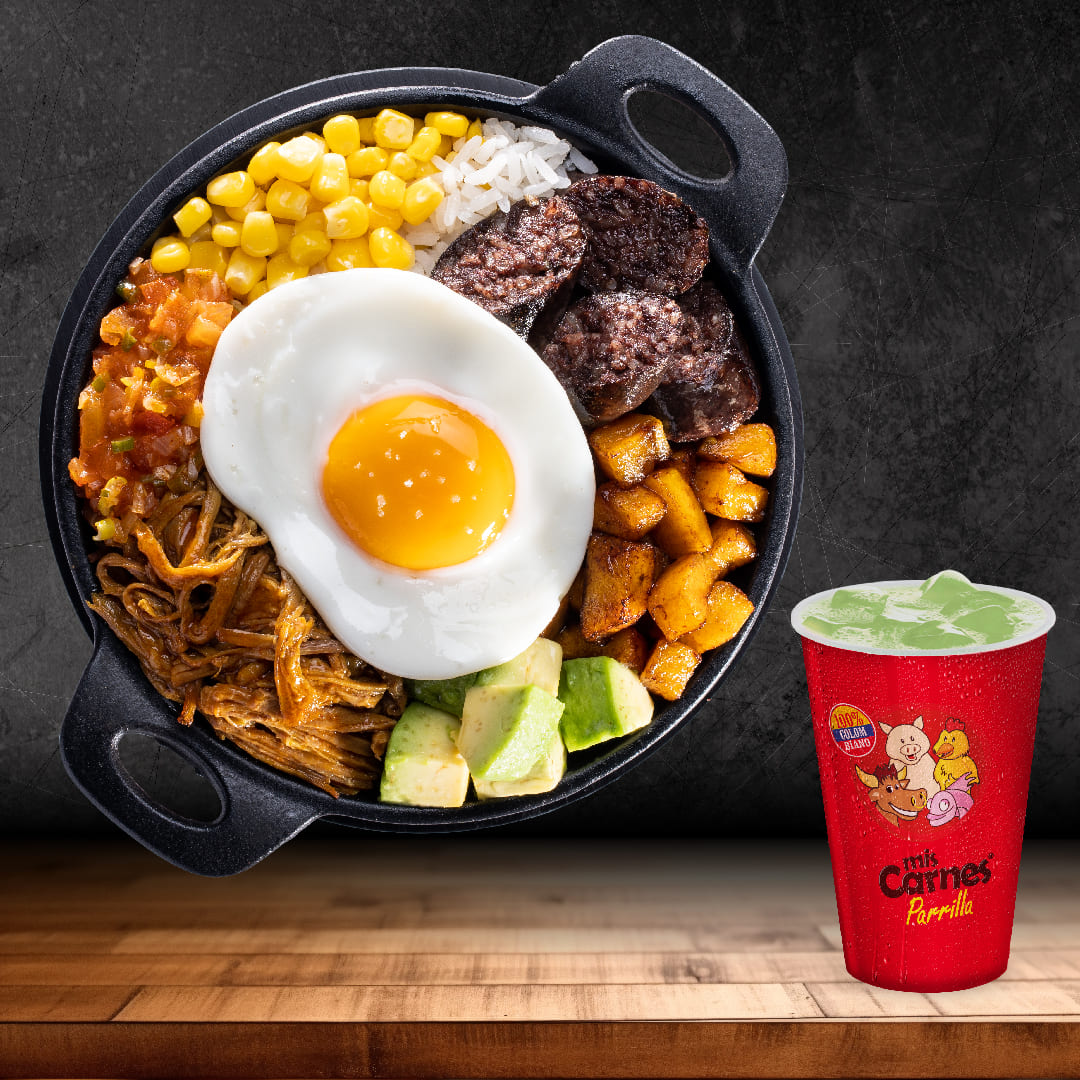 Arroz, carne desmechada, trozos de chicharron, huevo, papa criolla + bebida