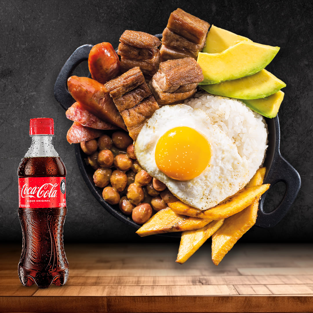 Bandeja paisa con frijol, arroz, aguacate, morcilla, chorizo, carne molida, huevo, arepa de pincho y Coca-Cola Original 400 ml.