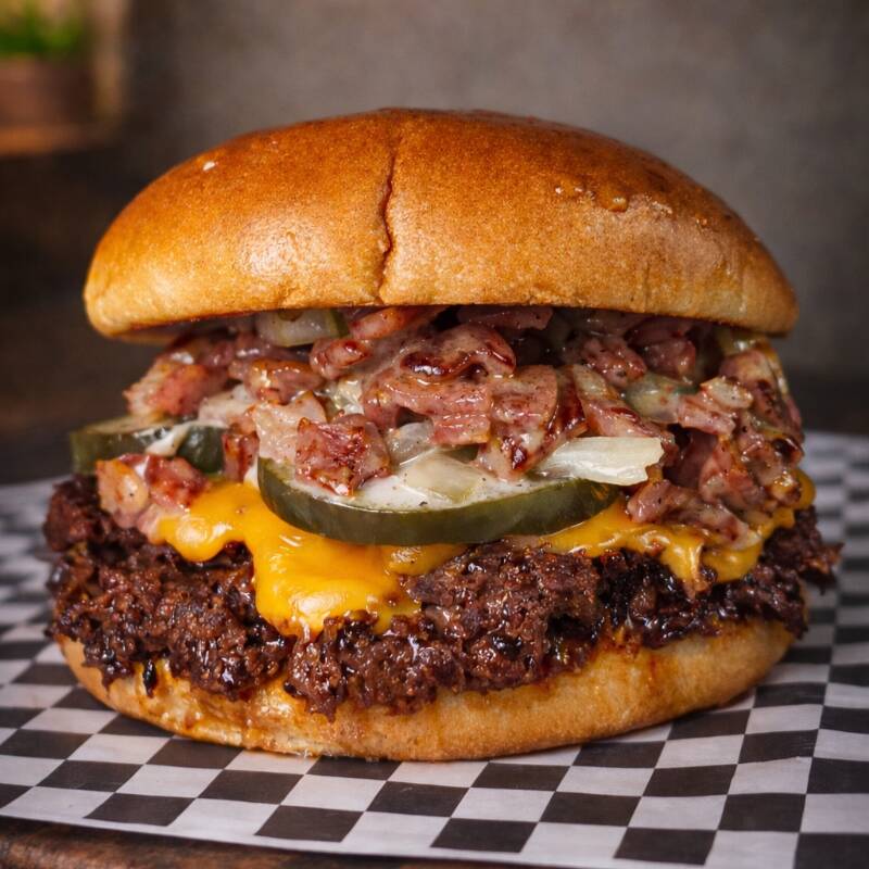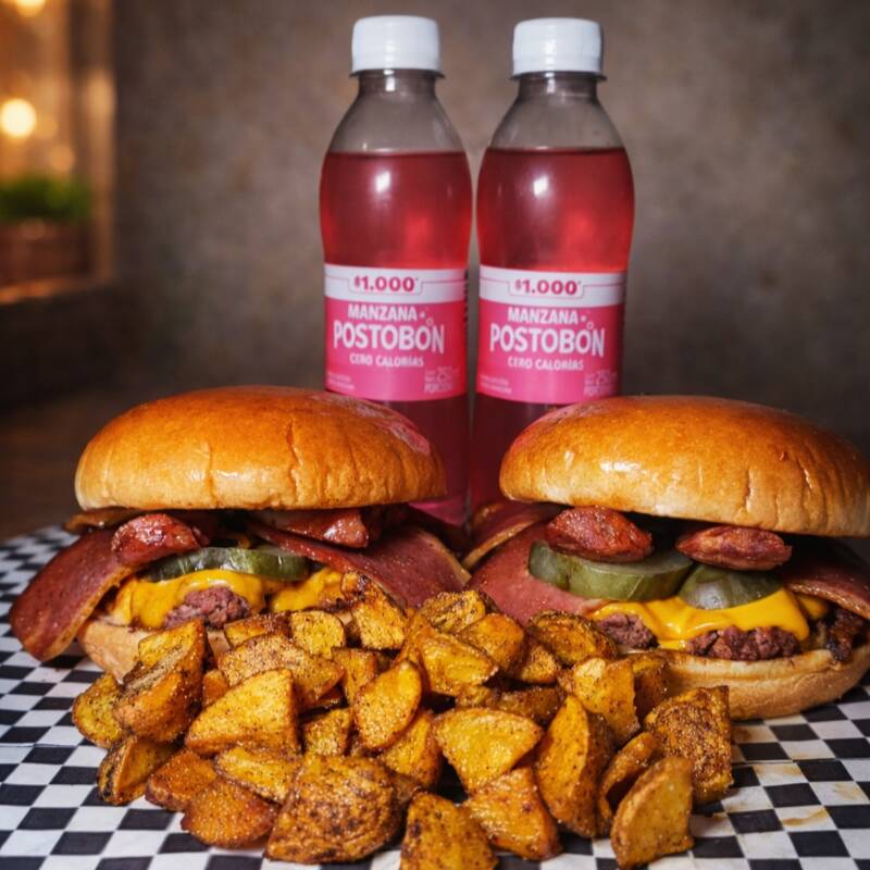 Doble carne smash de 100gr cada una, doble queso cheddar, salsa de la casa, queso azul, tocineta caramelizada, cebolla caramelizada, pepinillos, porción de papas