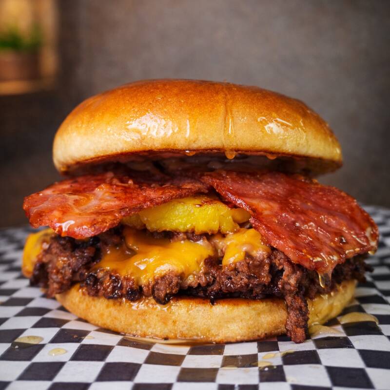 Doble carne smash de 100gr cada una, doble queso cheddar, salsa de la casa, tocineta, 2 rodajas de piña asada, porción de papas
