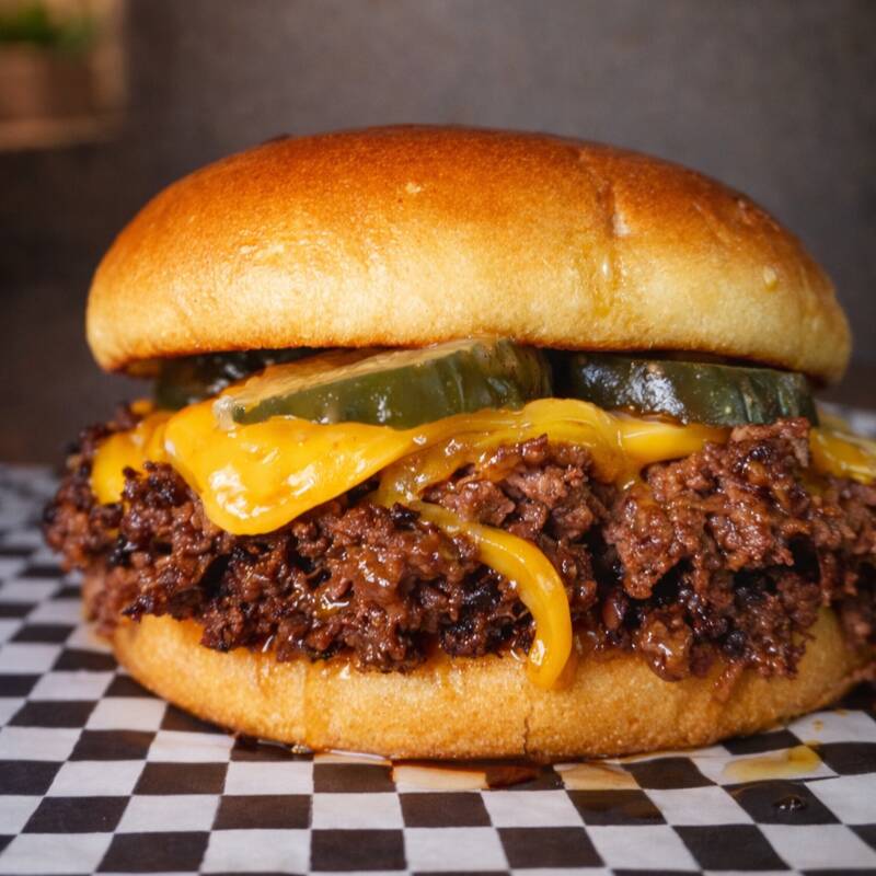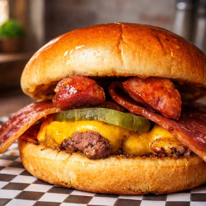 Carne Smash jugosa , queso cheddar, pepinillos, chorizo artesanal , salsas de la casa y una porcion de papas