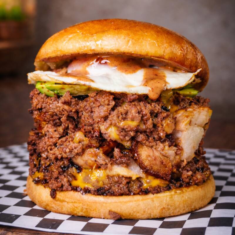 Doble carne smash de 100gr cada una, triple queso cheddar, salsa de la casa, chorizo artesanal, chicharrón, aguacate, huevo, cebolla crispy, porción de papas