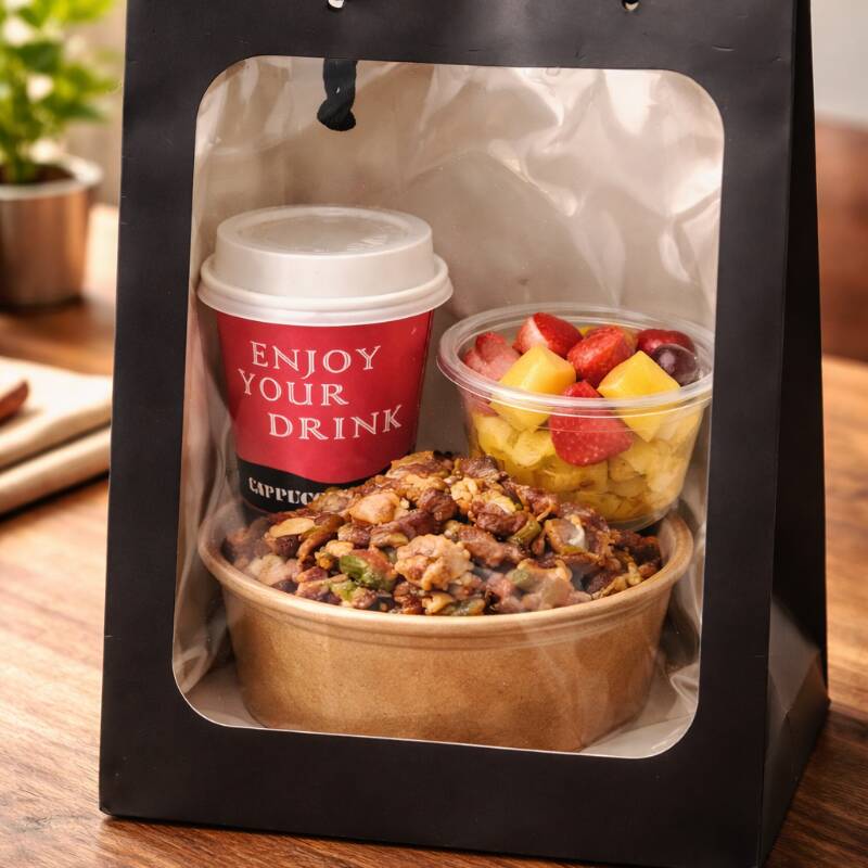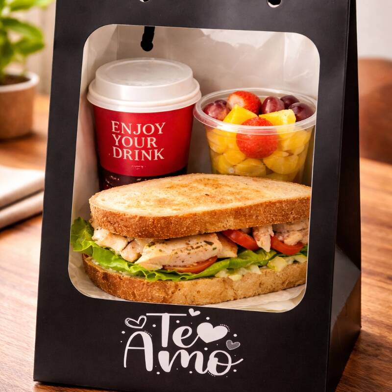 Sándwich de filete de pollo, café con leche o chocolate, fruta picada o crepa de chocolate. Bolsa decorativa