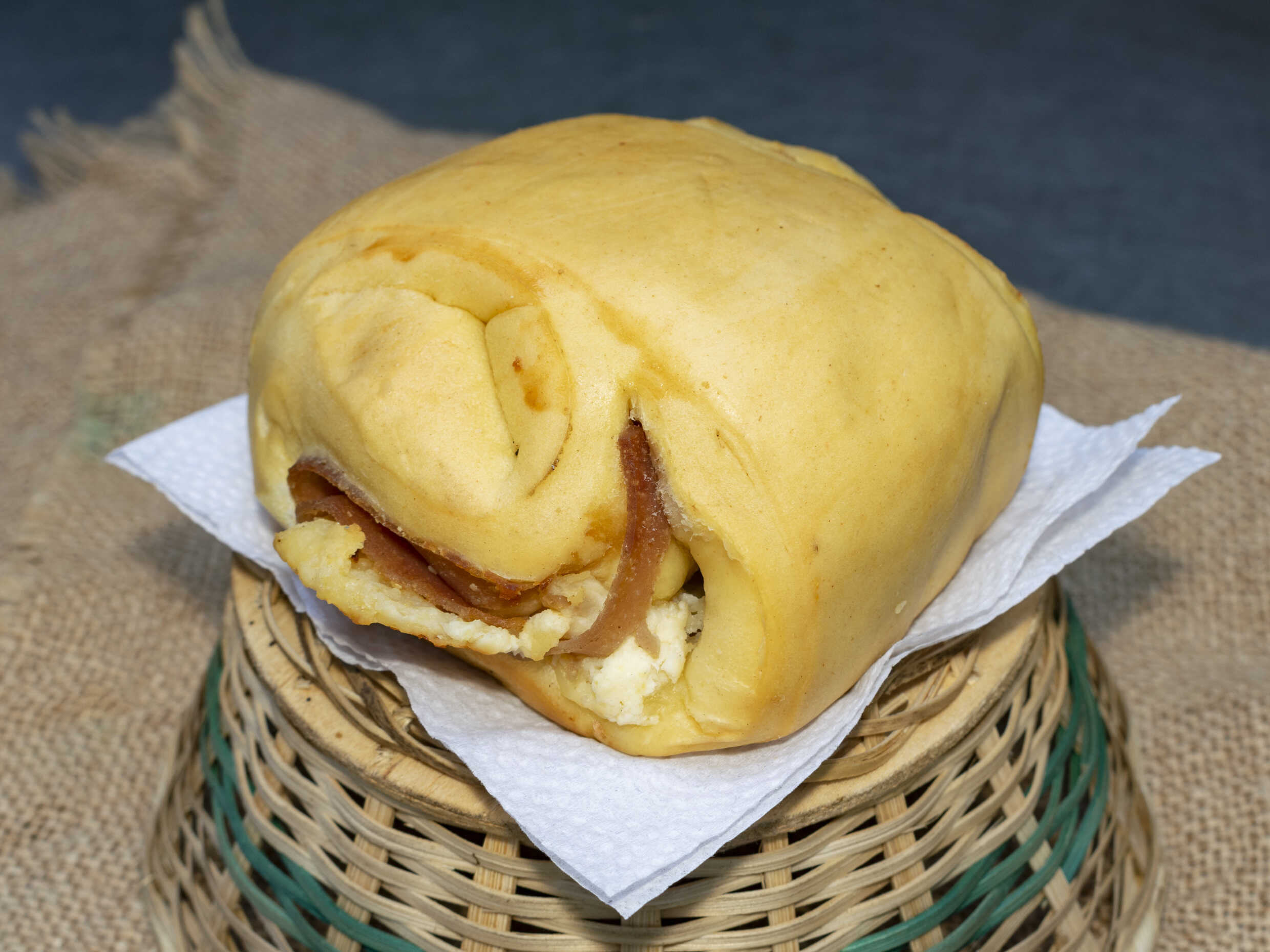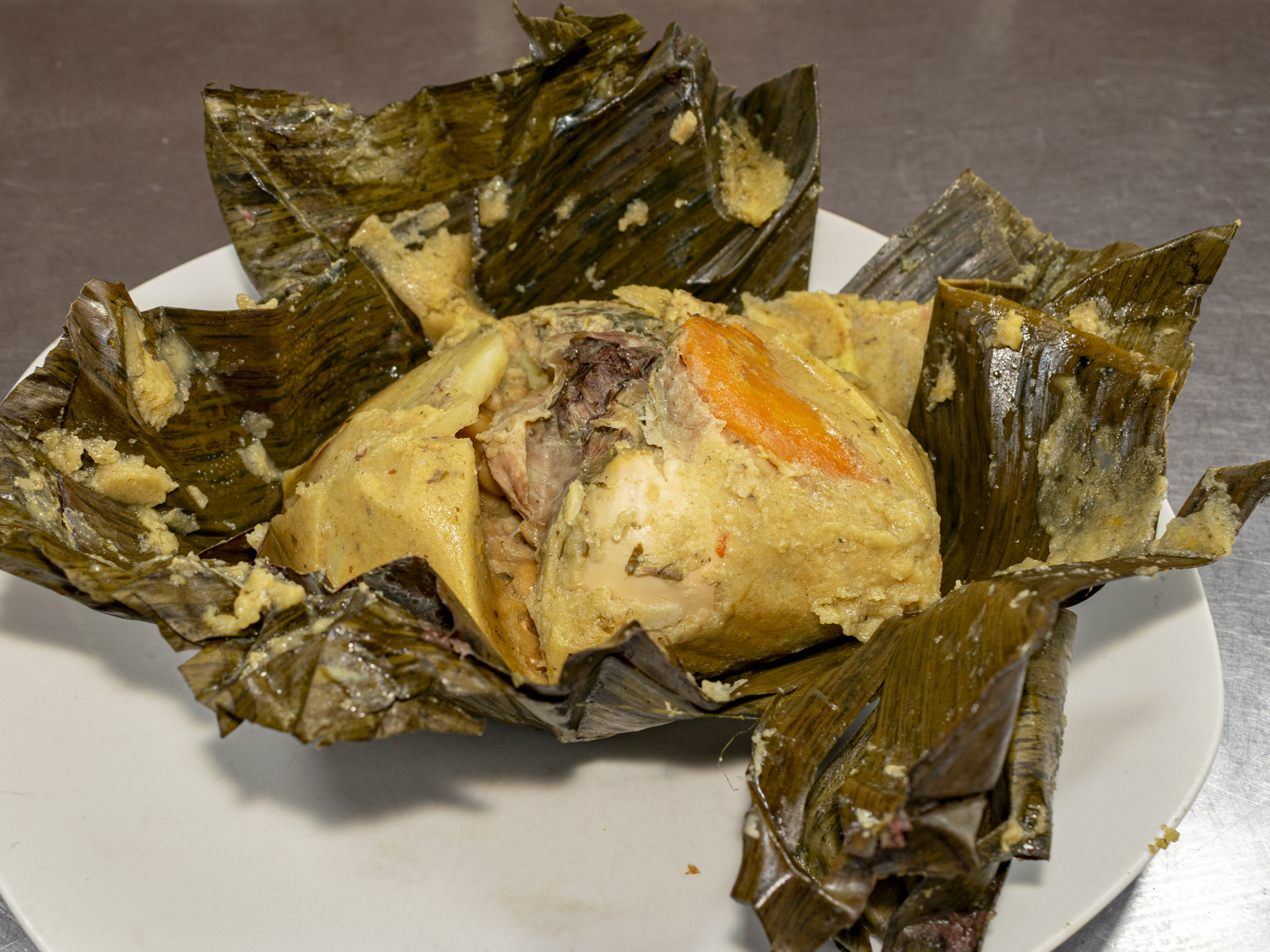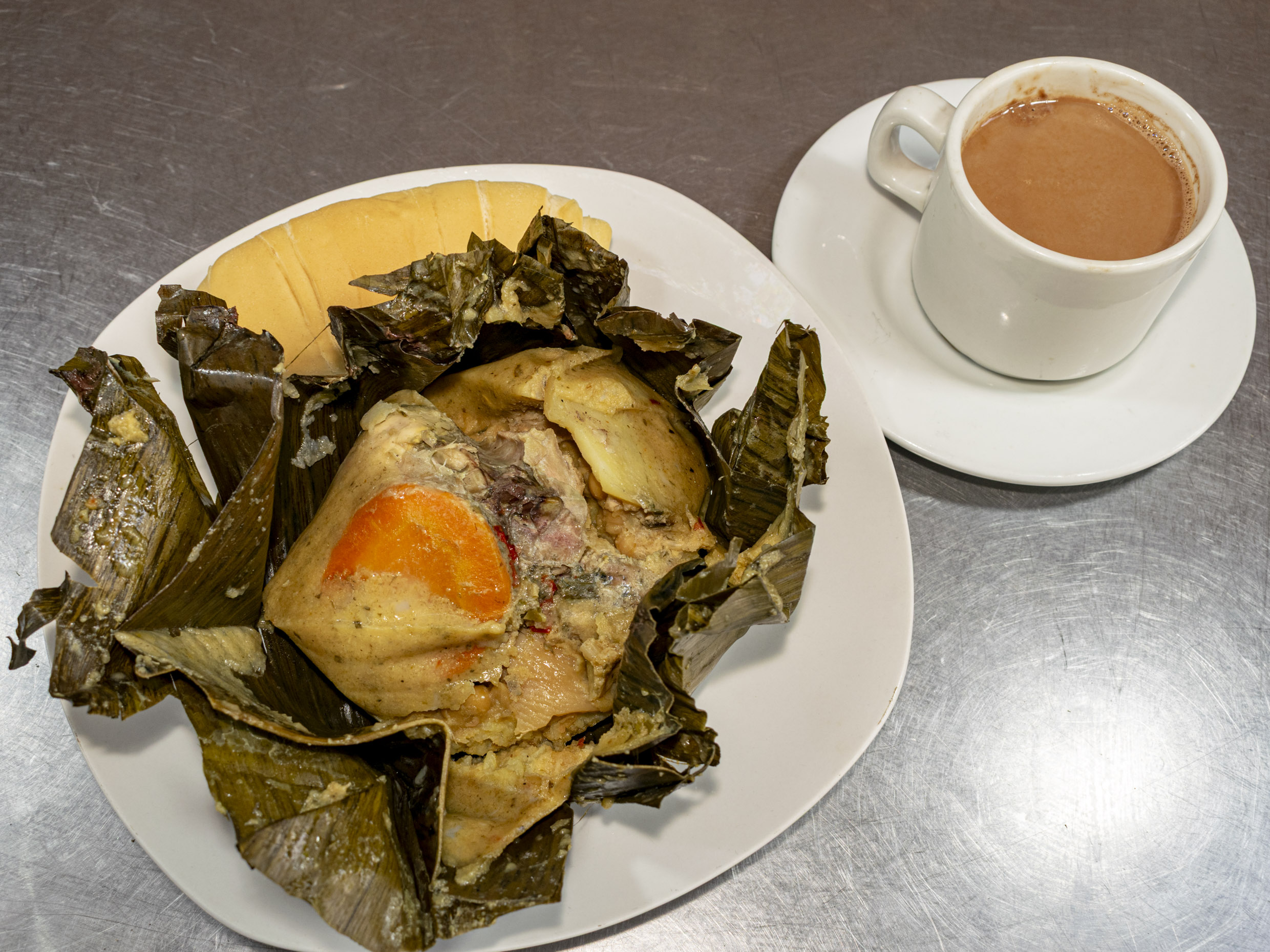Cerdo, pollo, huevo, zanahoria, papa, masa de maíz con arveja amarilla y arroz, acompañada de pan, café con leche, café negro ó chocolate.