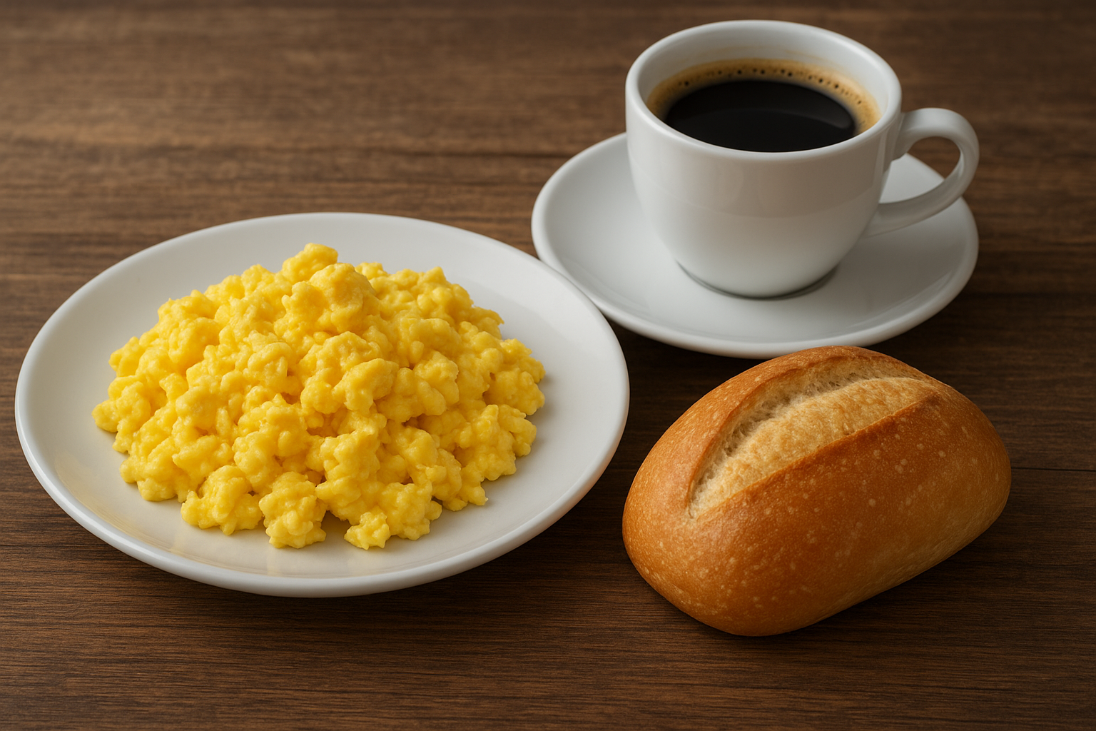 2 huevos revueltos más pan cascarita, más café en leche o negro