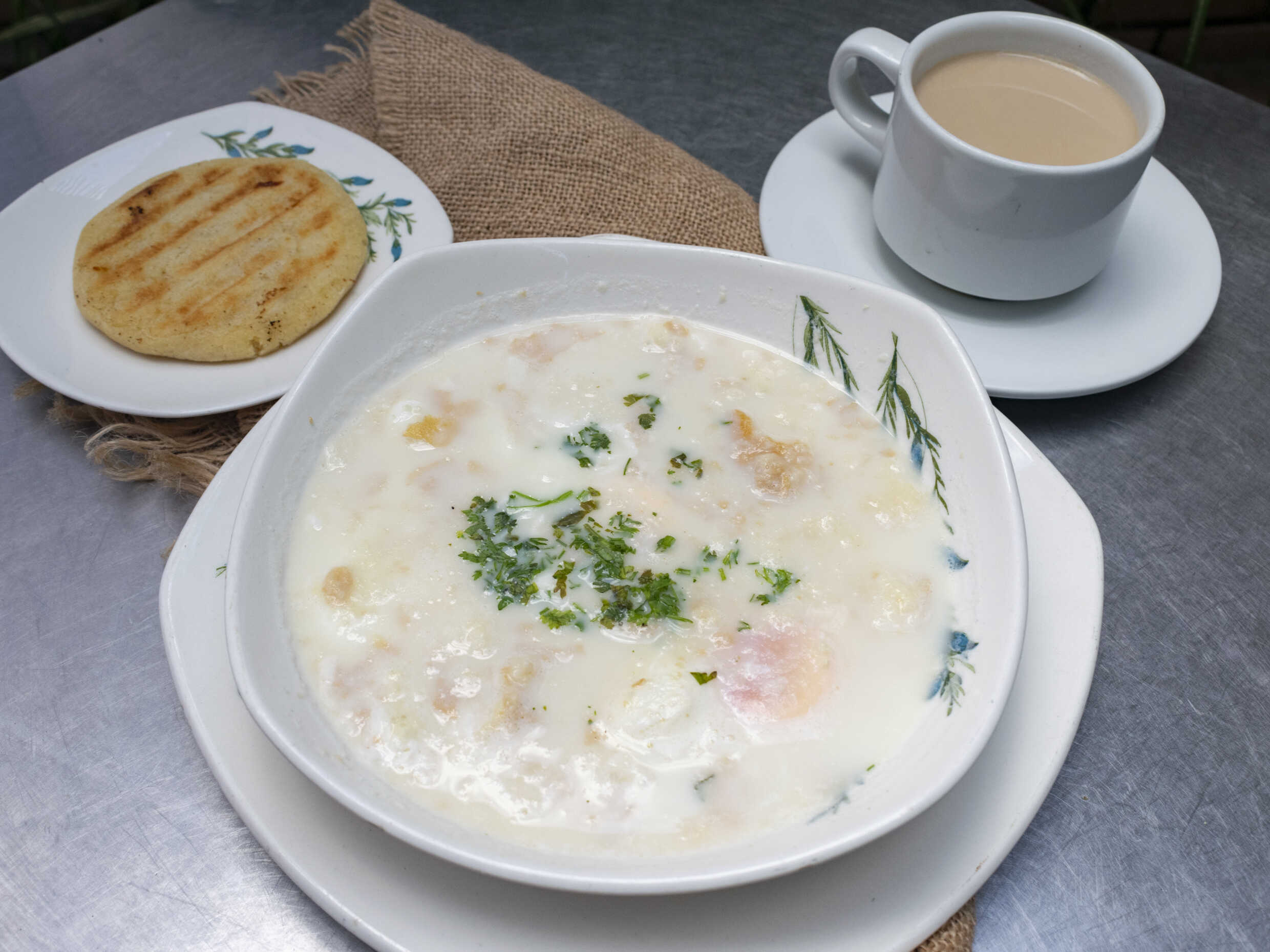 caldo con 2 huevos , leche y tostado, aderezado con cebolla, ajo y cilantro acompañado de cafe leche y arepa asada con queso