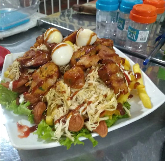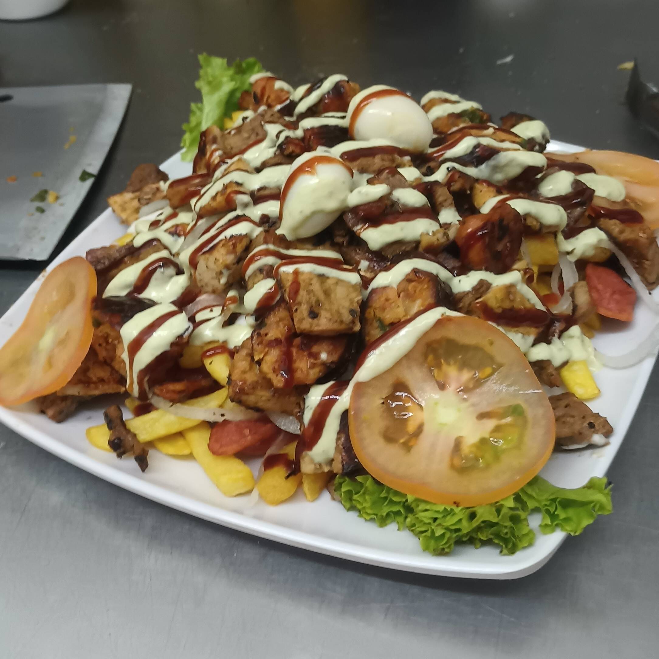 250 Gr papas a la francesa (rapipapa), salchicha pimpollo, vegetales (cebolla y tomate), longaniza de pierna de cerdo de la casa, pollo desmechado, huevo de codorniz, y salsas.
