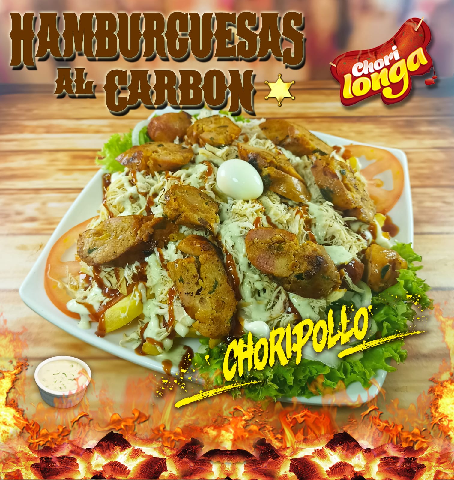 400 Gr papas a la francesa, salchicha pimpollo, vegetales (cebolla y tomate), longaniza de pierna de cerdo de la casa, pollo desmechado, 2 huevos de codorniz, y salsas.