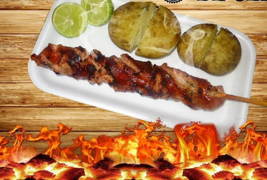 Papas a la francesa(rapipapa), salchicha pimpollo, vegetales frescos, carne de res, pechuga de pollo y lomo de cerdo asados al carbón, longaniza de pierna de cerdo de la casa, huevos de codorniz y salsas de la casa. las porciones son de acuerdo a la presentación elegida. .