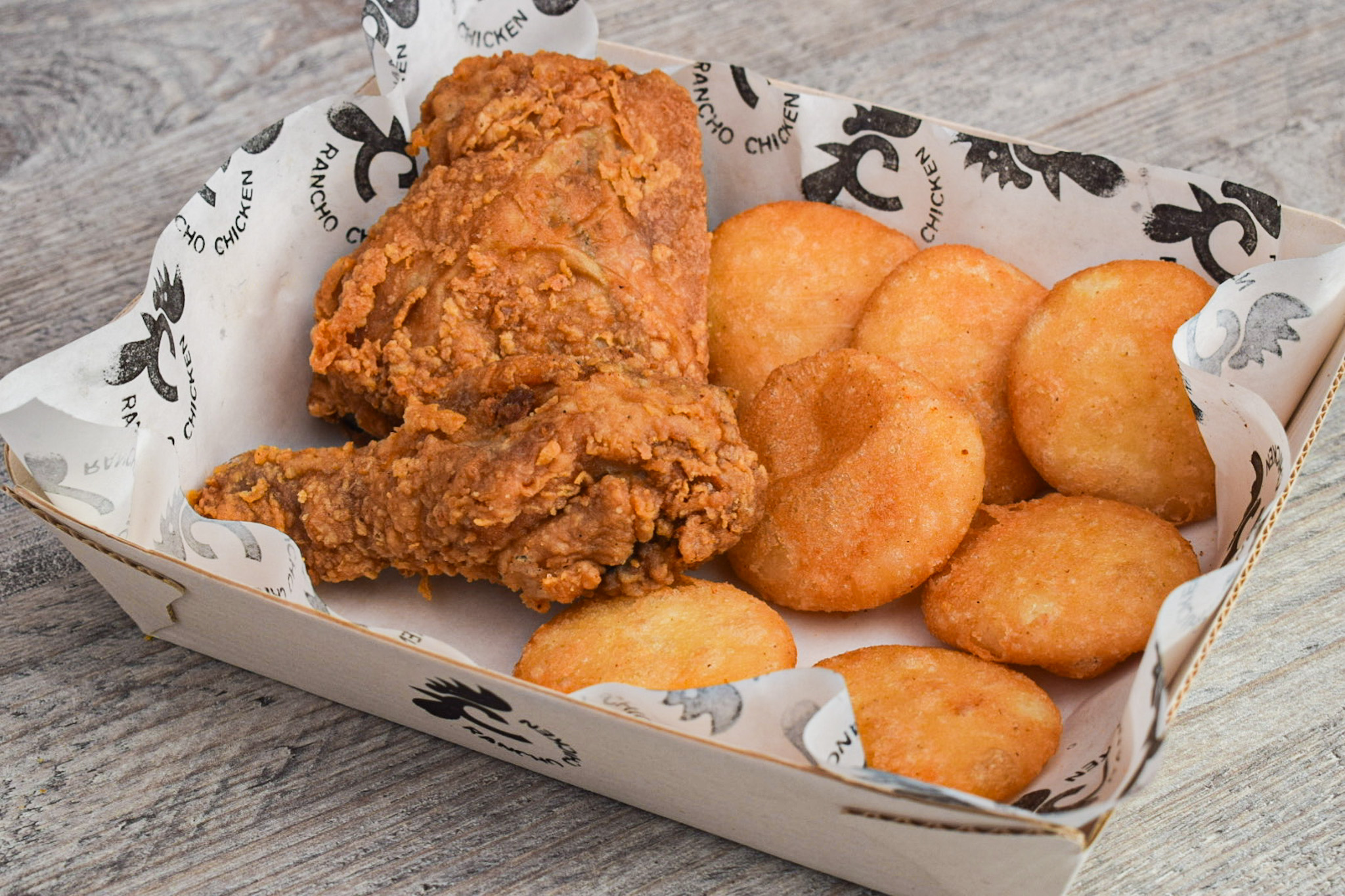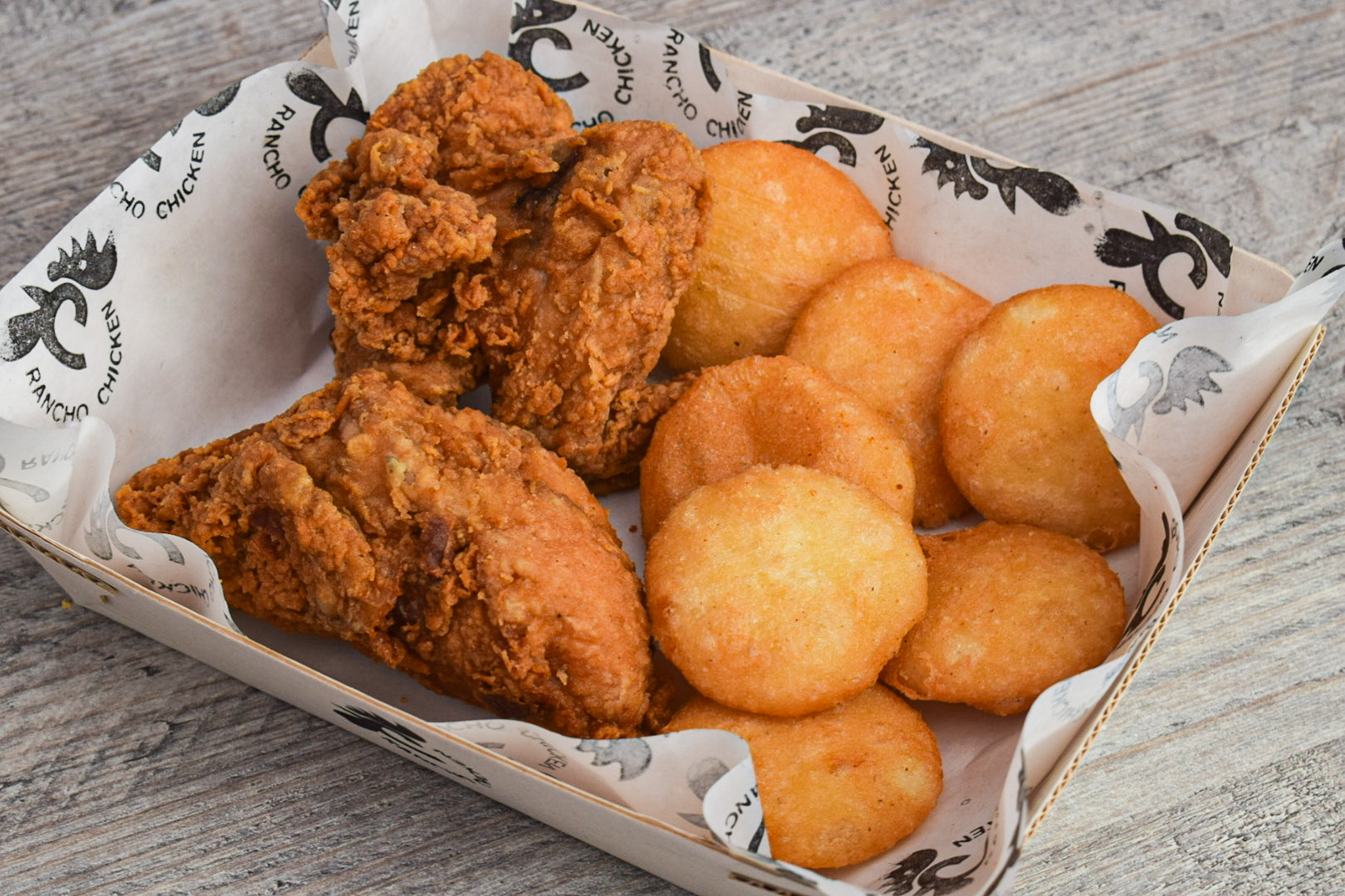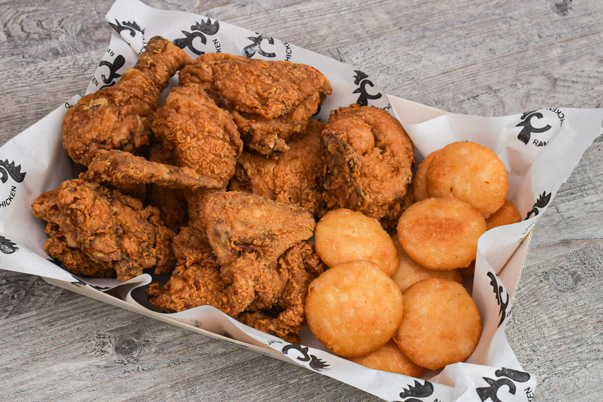 8 Presas de pollo broaster, 10 arepitas de queso y mantequilla, miel y salsa de tomate.
