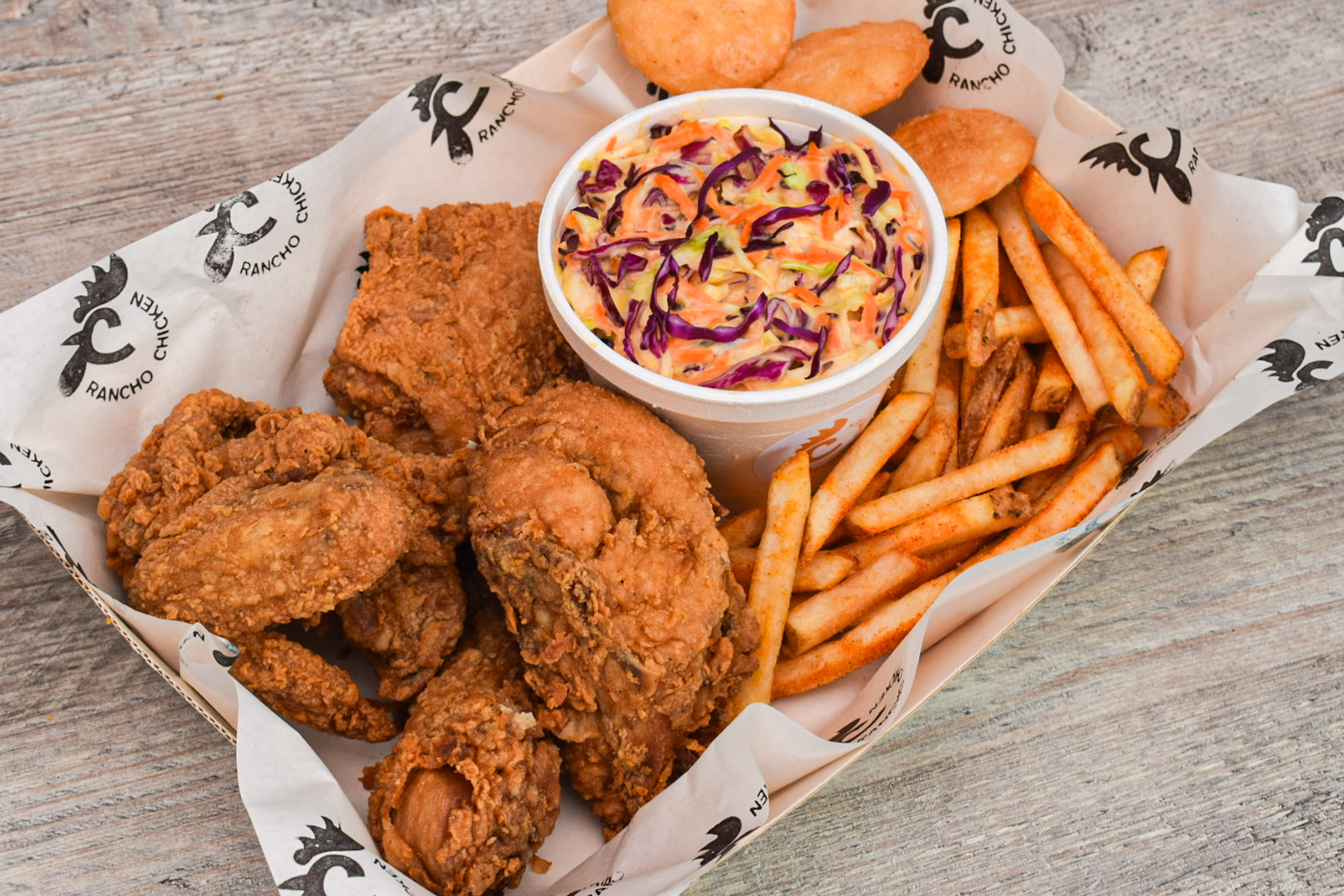 4 Presas de pollo broaster, papa francesa, 5 arepitas de queso y mantequilla, ensalada coleslaw, miel y salsa de tomate.