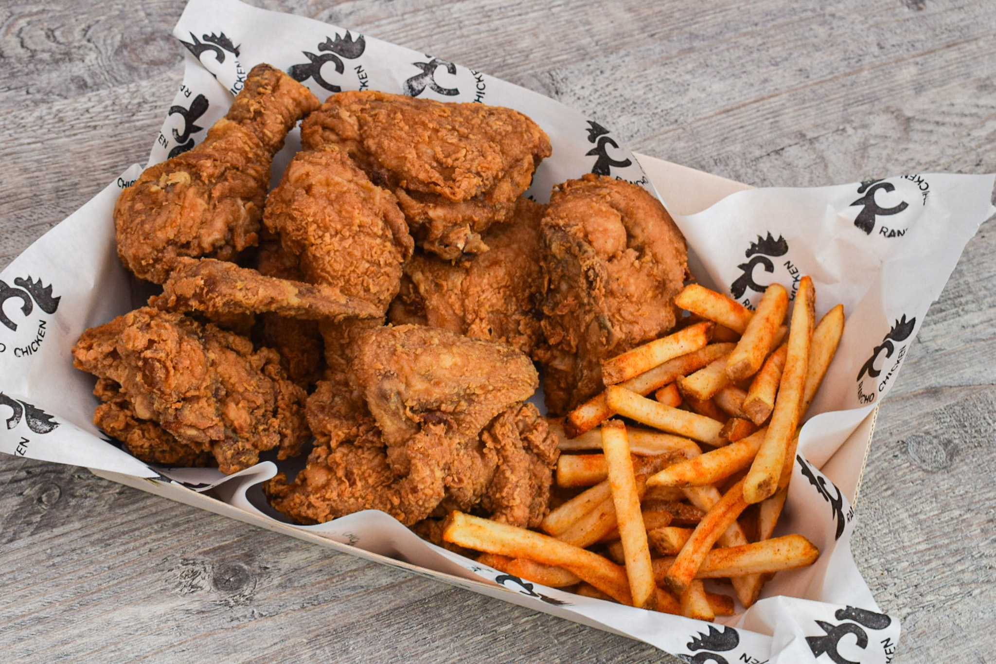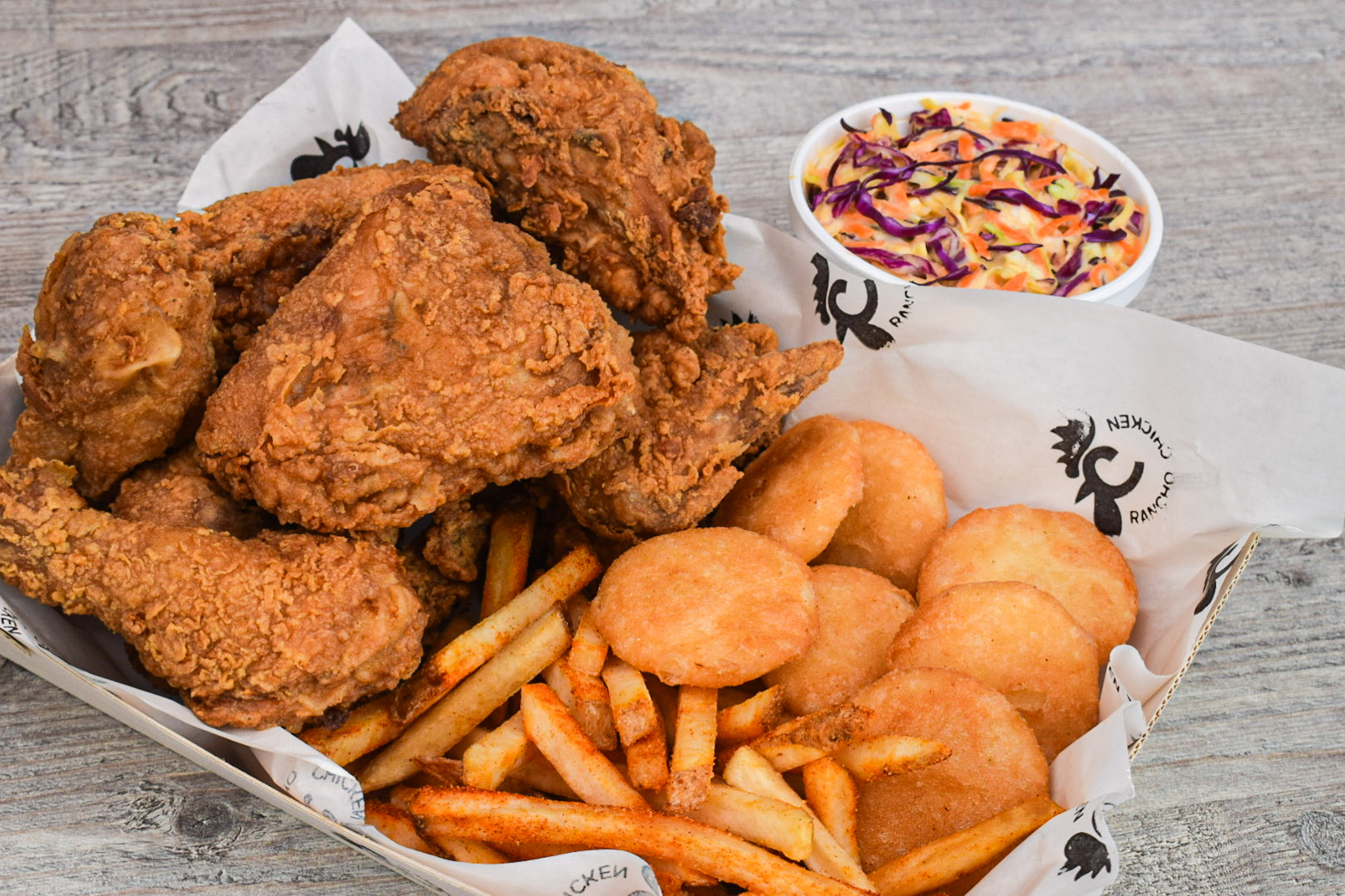 8 Presas de pollo broaster, papa francesa, 10 arepitas de queso y mantequilla, ensalada coleslaw, miel y salsa de tomate.