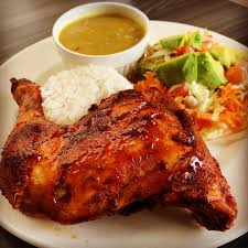 Pernil de pollo frito, arroz blanco, tajadas de maduro, principio del día, ensalada del día, sopa del día y limonada