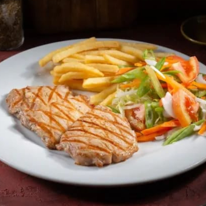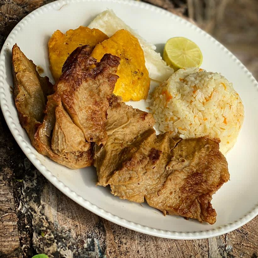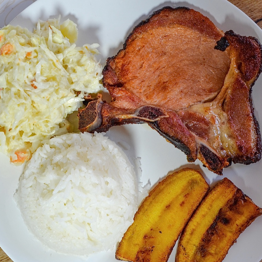 120g de chuleta de cerdo, arroz blanco, tajadas de maduro, ensalada del día, sopa del día y limonada