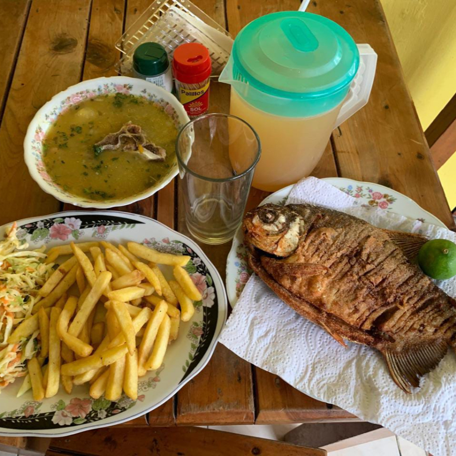 180-200g de cachama frita, arroz blanco, tajadas de maduro, principio del día, ensalada del día, sopa del día y limonada