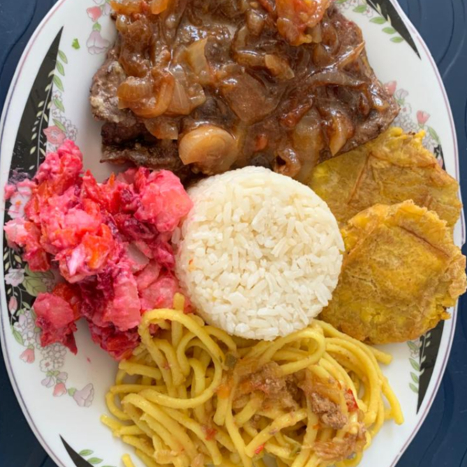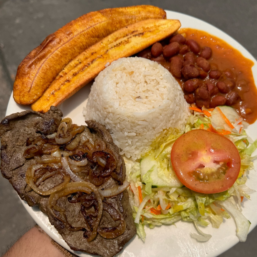 120g de Carne de res, arroz blanco, tajadas de maduro, ensalada del día, sopa del día y limonada