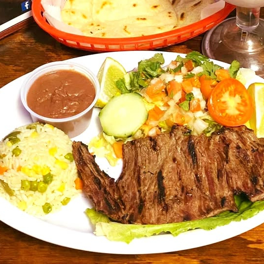 120g de carne asada en bistec, arroz blanco, tajadas de maduro, ensalada del día, sopa del día, principio del día y limonada