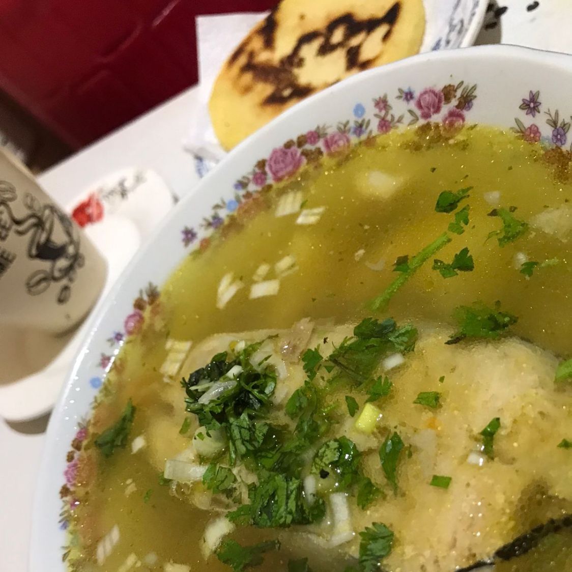 Caldo con papa cocida, arepa y café con leche.