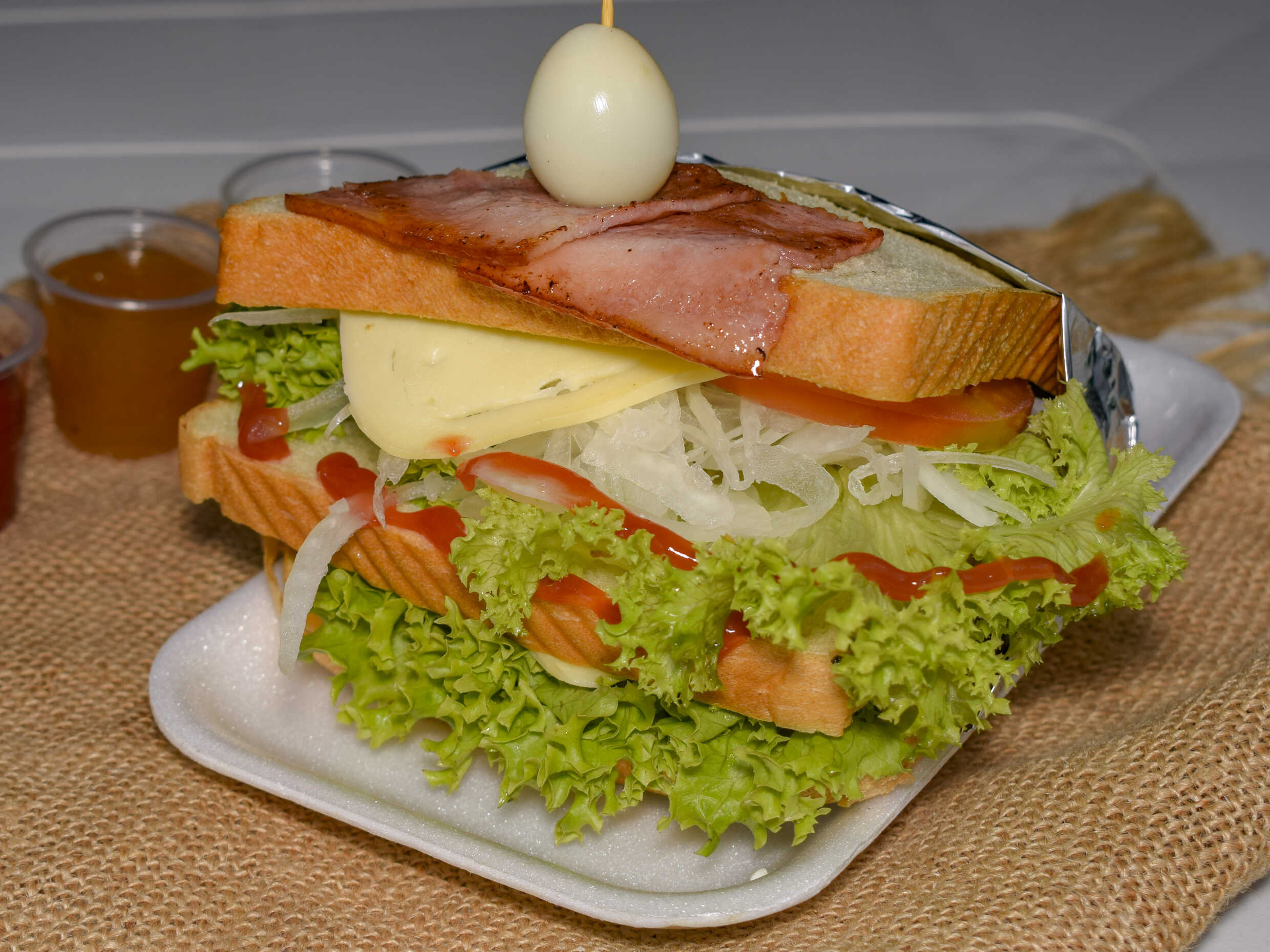 Lechuga, cebolla, tomate, jamón, queso, piña, tártara, salsa de tomate y huevo de codorniz.