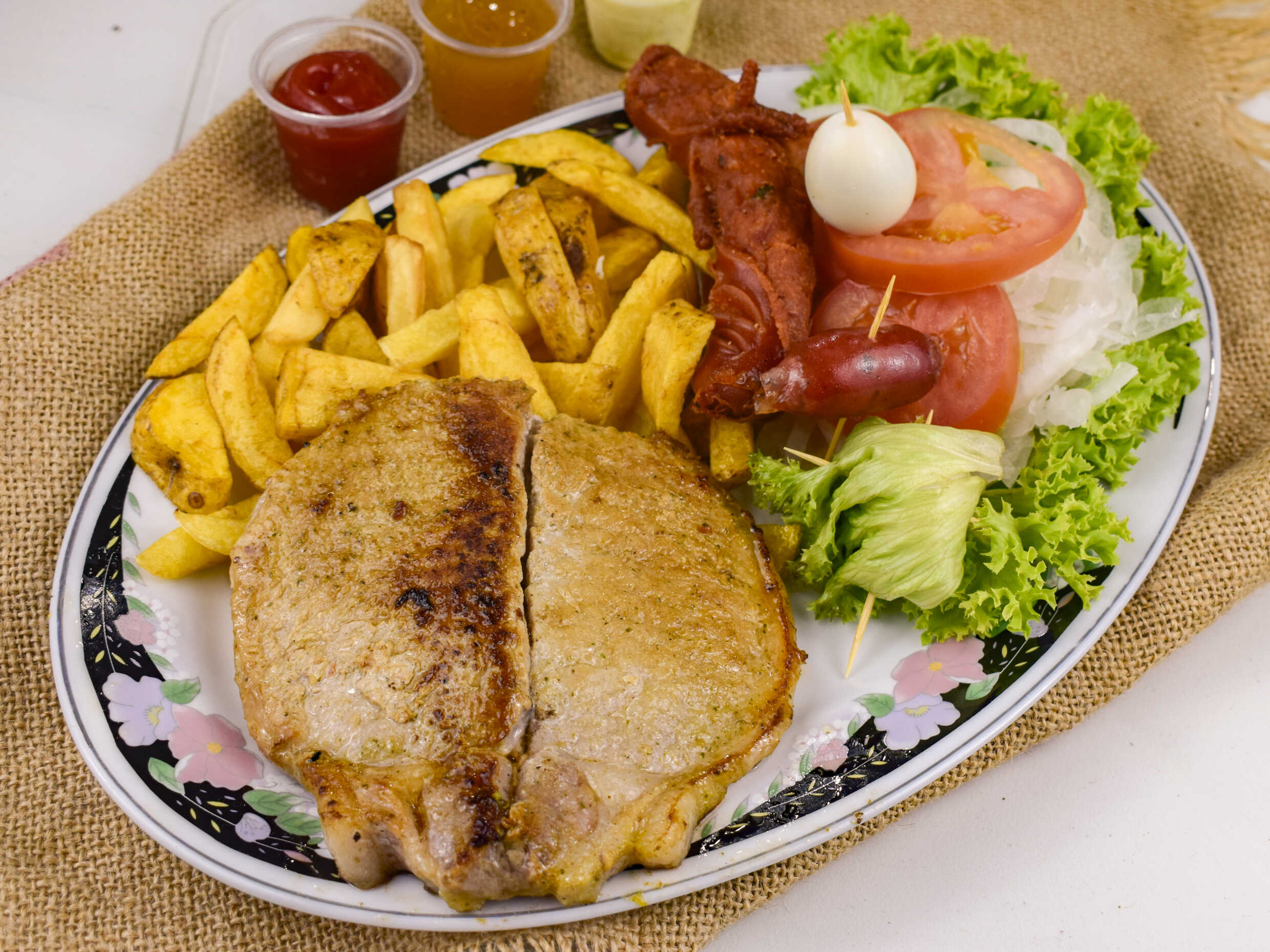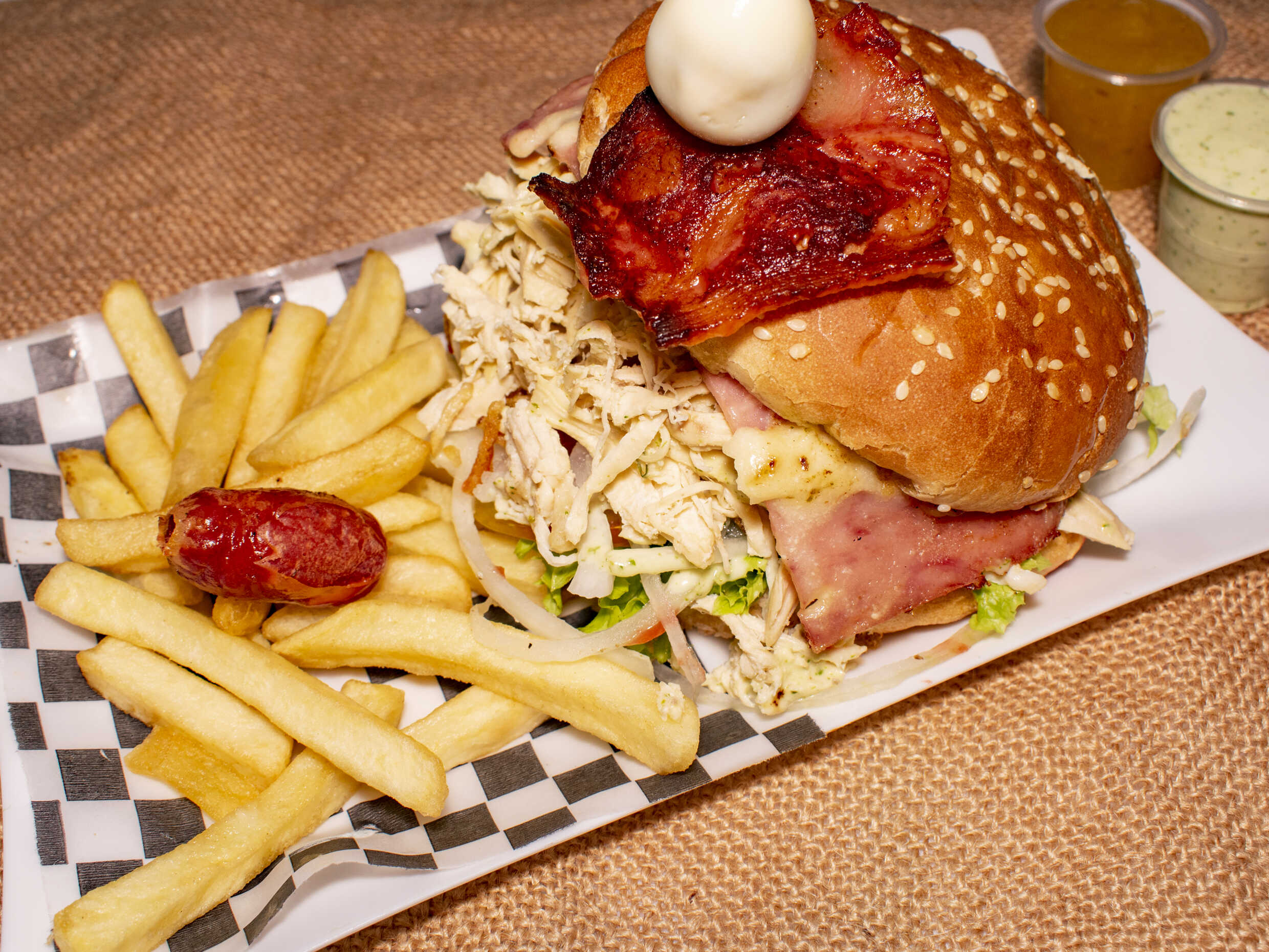 Hamburguesa de carne desmechada, lechuga, cebolla, tomate, jamón, queso, piña, tártara, salsa de tomate y huevo de codorniz.
