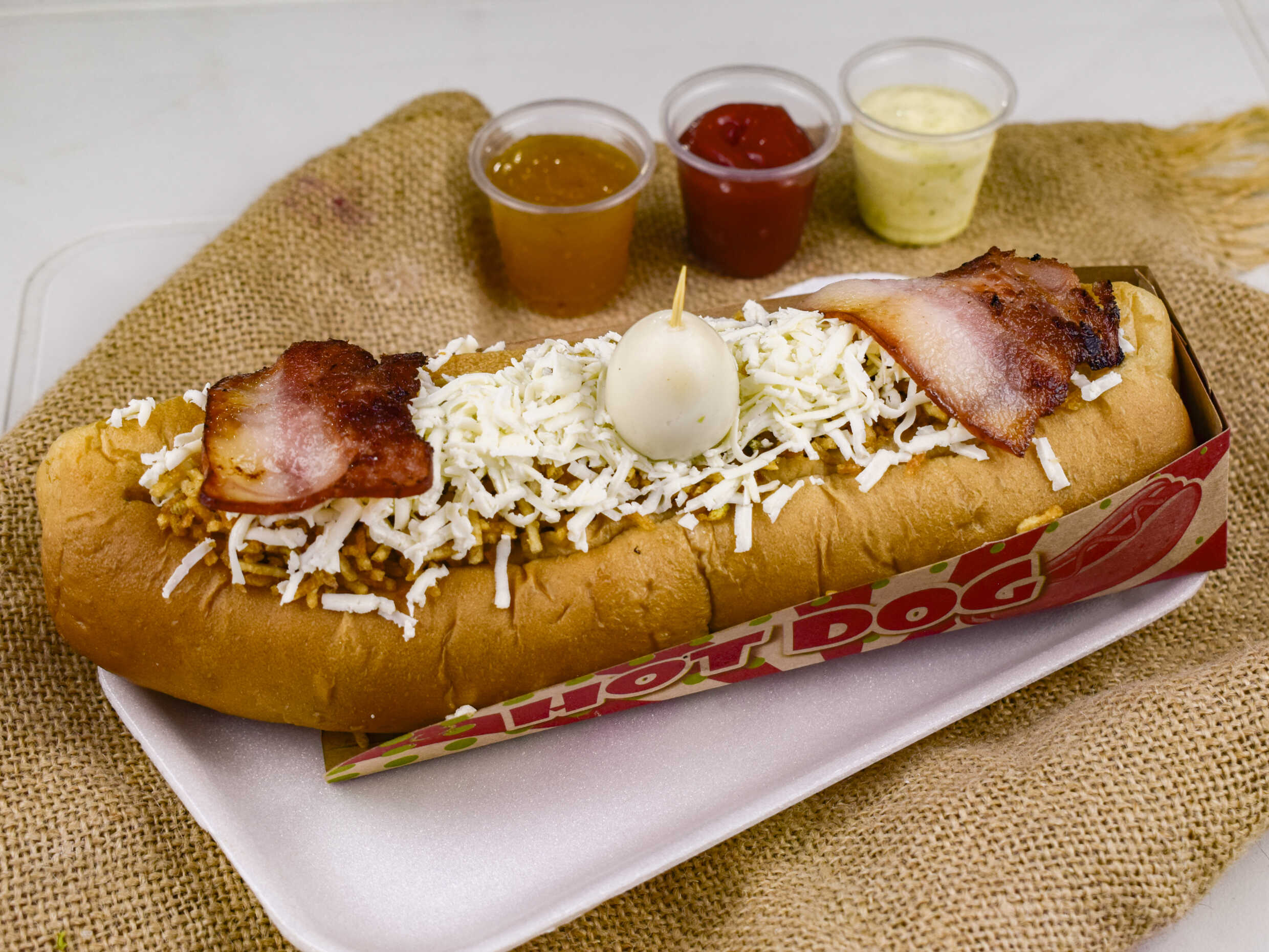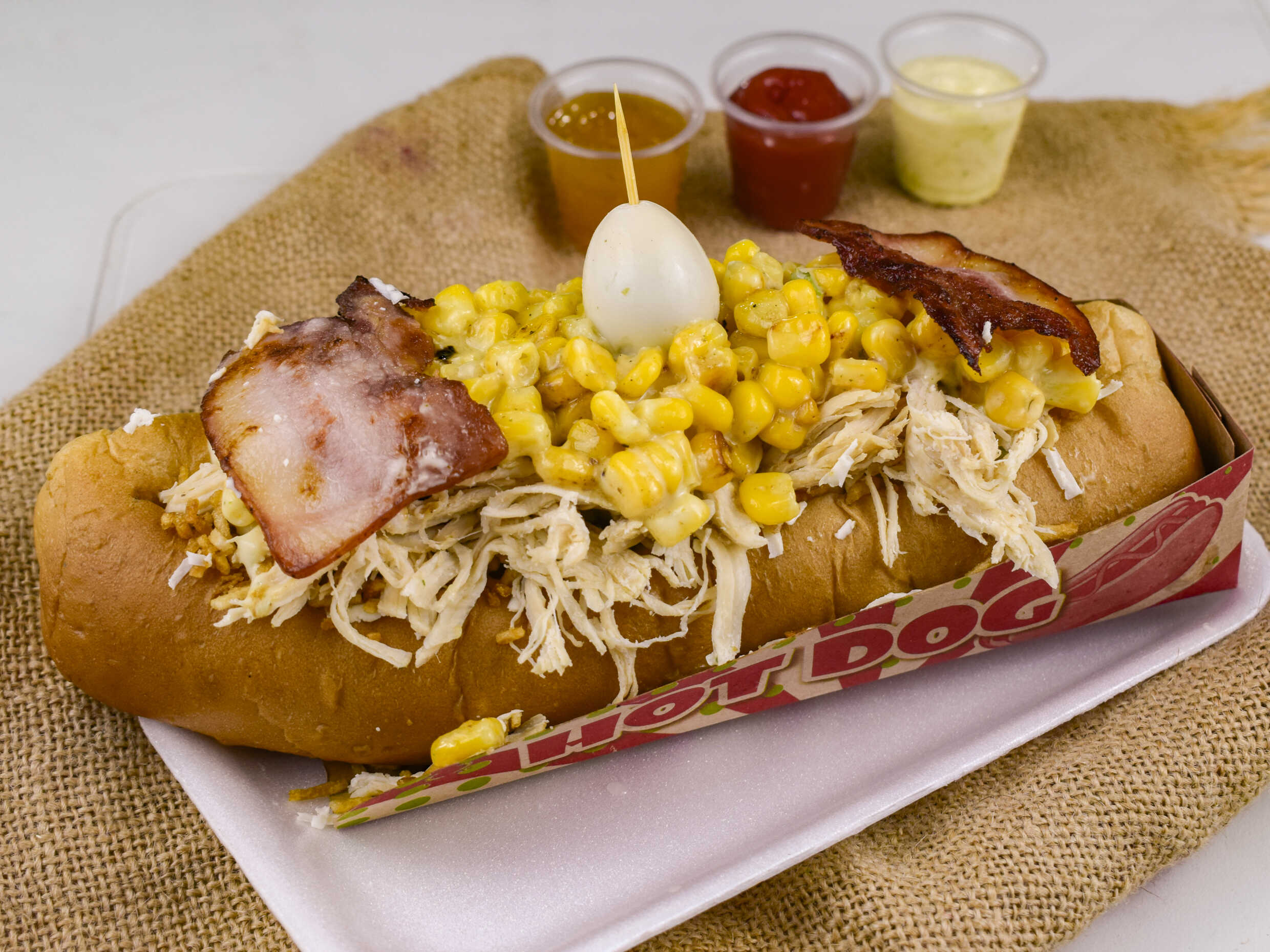 Perro súper tobi, salchicha, doble pan, tocineta, cebolla, papa, piña, queso, tártara, salsa de tomate y huevo de codorniz.