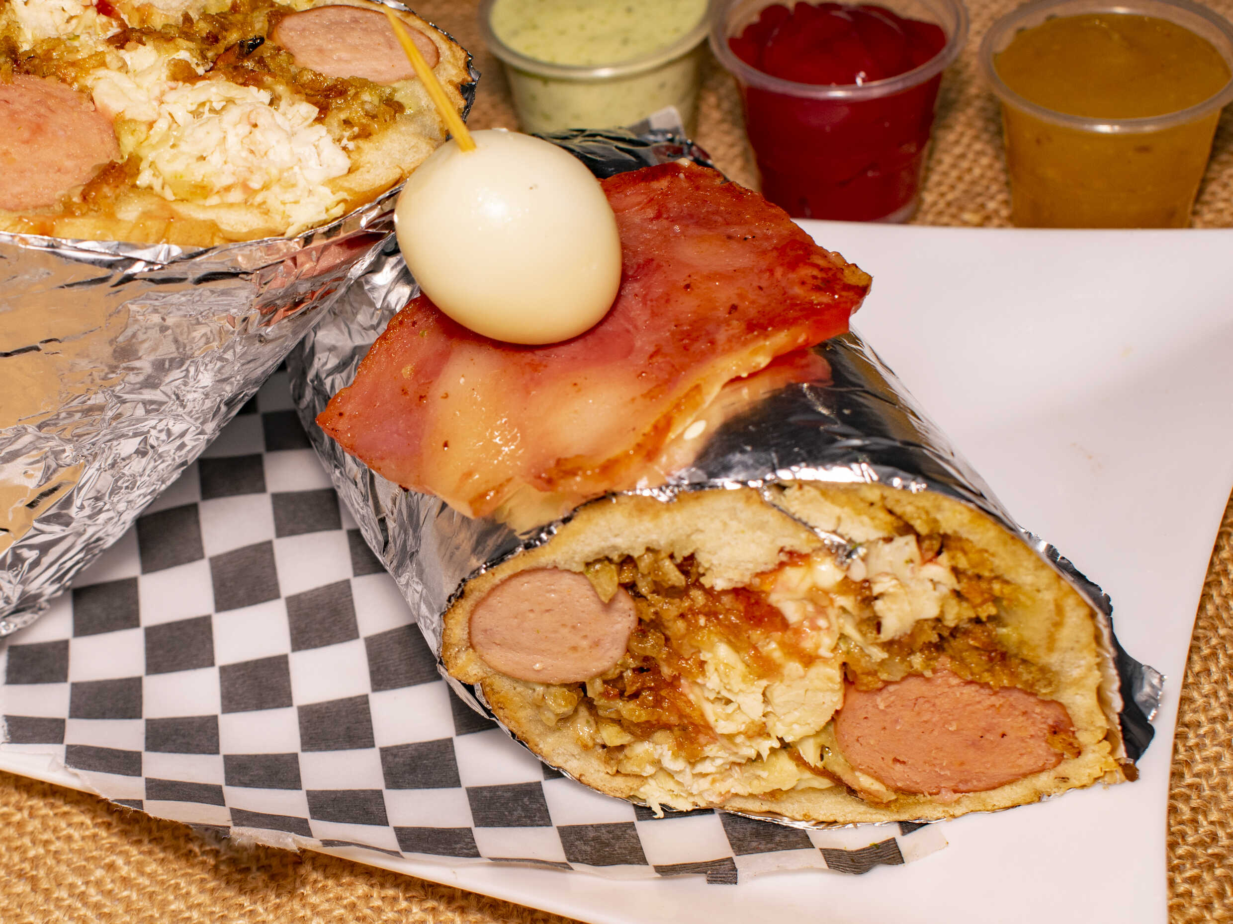 Perro mixto, salchicha, pollo, tocineta, cebolla, piña, tártara, salsa de tomate y huevo de codorniz.