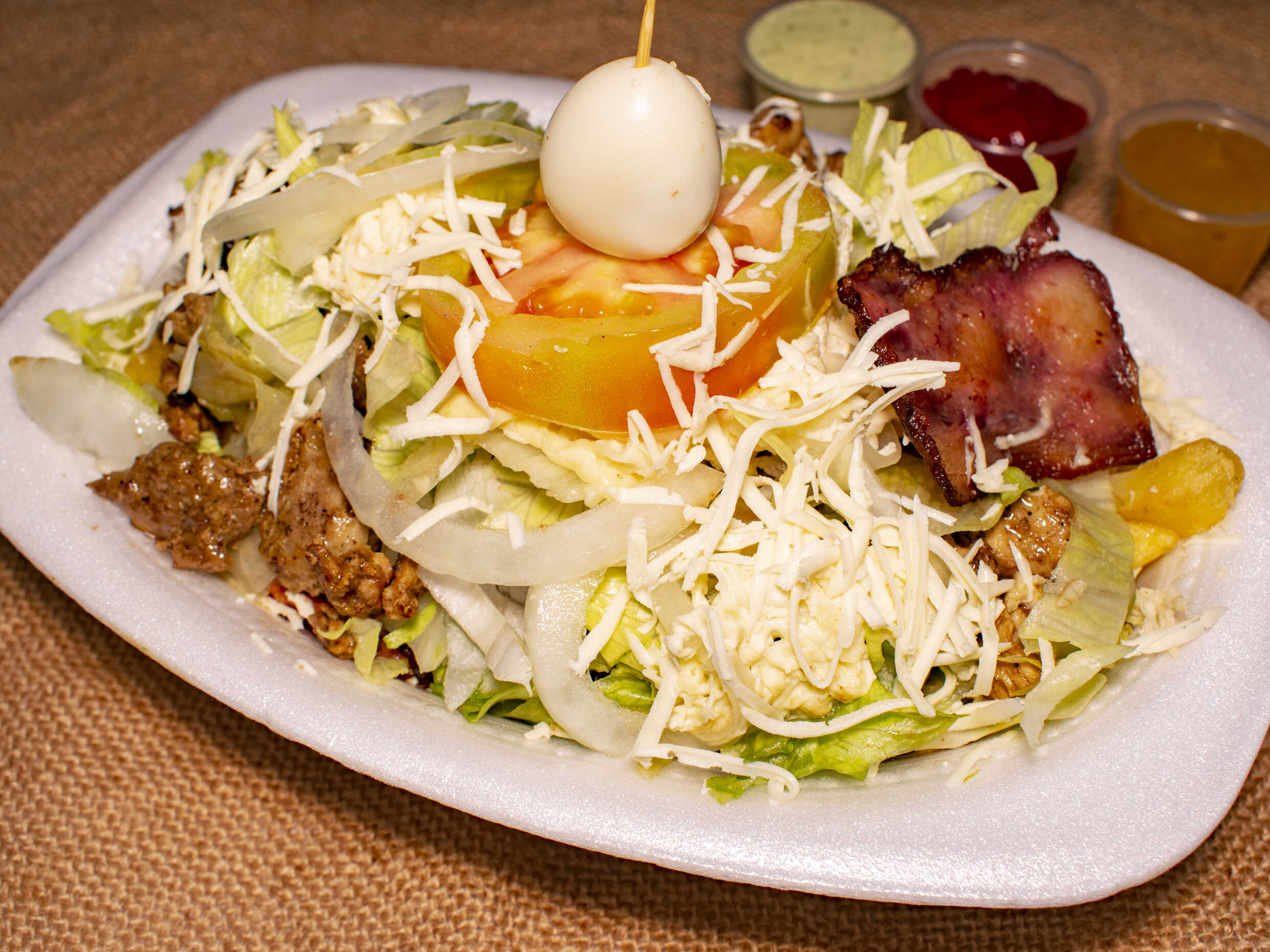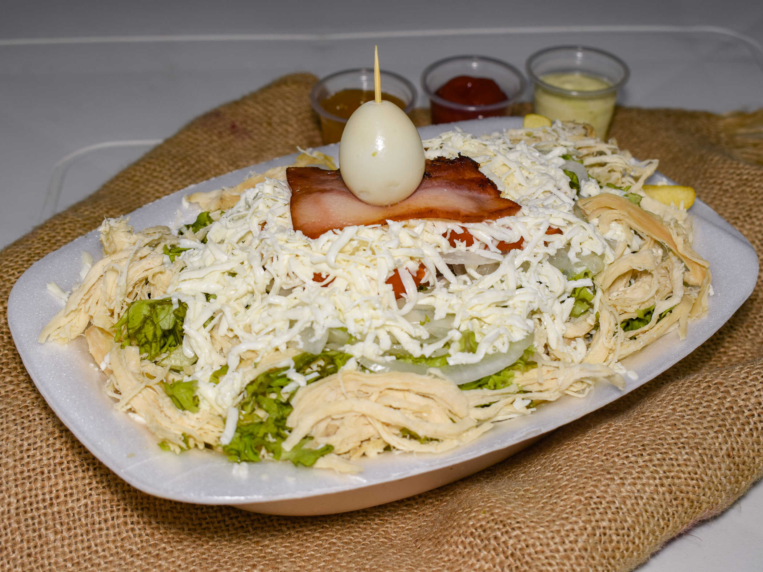 Lechuga, tomate, cebolla, carne picadita, pollo desmechado, queso gratinado, salchicha, queso rallado y huevo de codorniz.