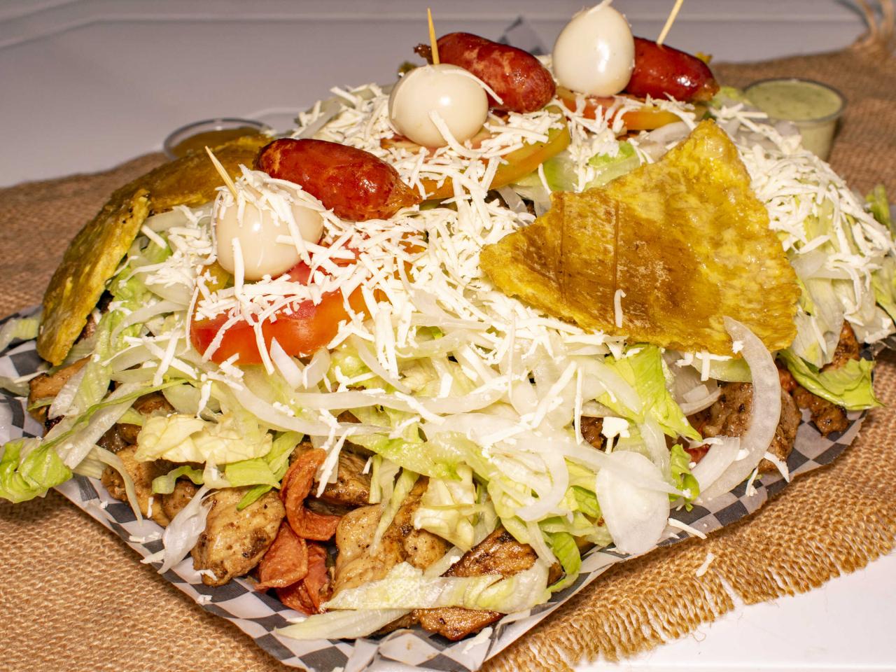 Carne, salchicha, papa, cebolla, tomate, lechuga, tártara, salsa de tomate, queso rallado, tocineta y huevo de codorniz.
