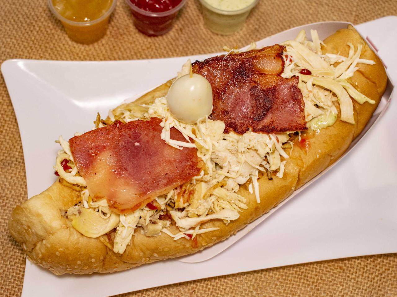 Perro americano, salchicha americana, tocineta, cebolla, piña, tártara, salsa de tomate y huevo de codorniz.