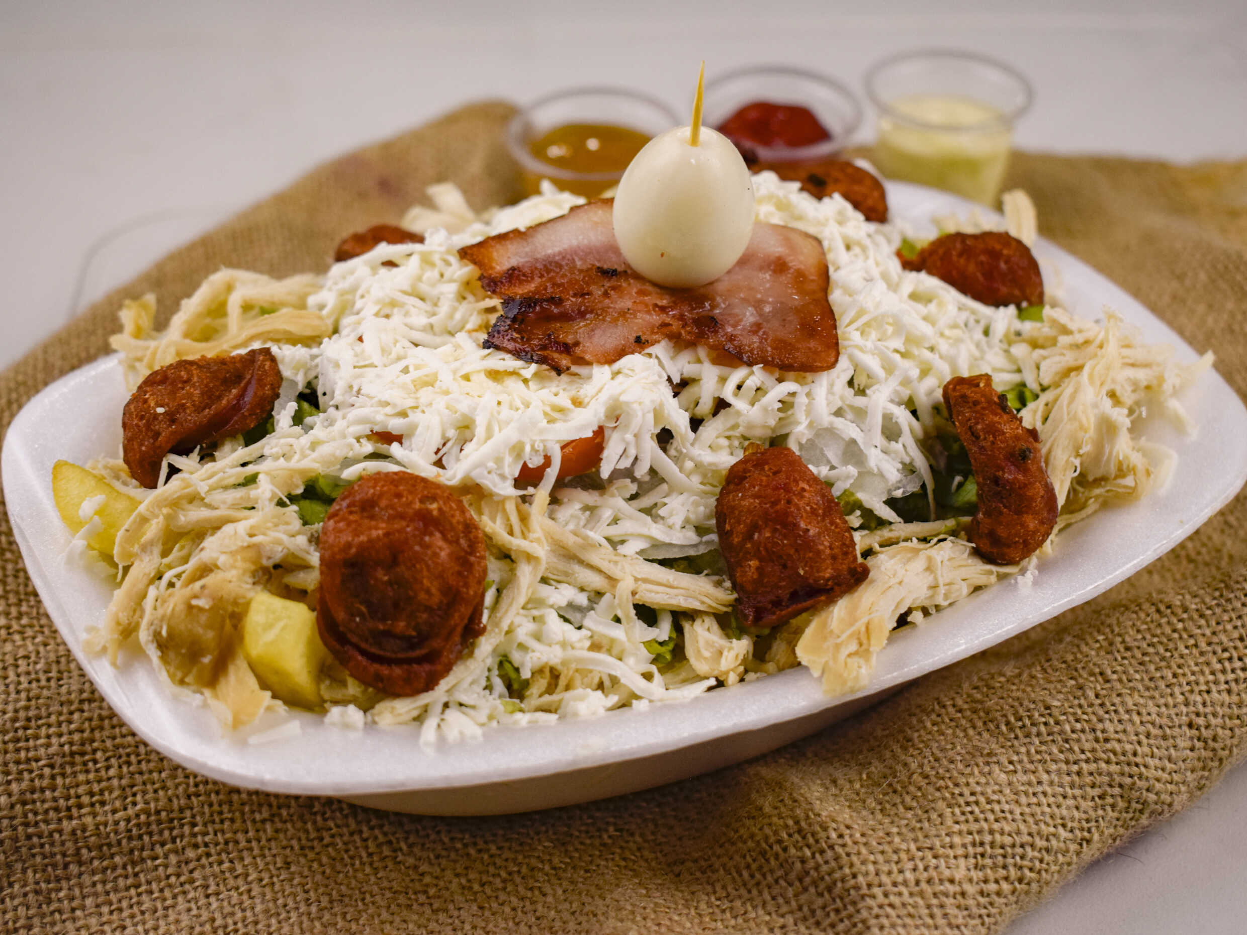 Pollo, salchicha, papa, queso rallado, cebolla, tomate, lechuga, tártara, salsa de tomate, tocineta y huevo de codorniz.