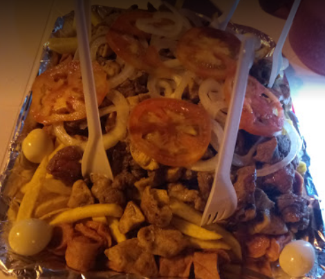 Perro loco, pollo, salchicha, carne en cuadros, tocineta, cebolla, piña, papa, tártara, queso, salsa de tomate y huevo de codorniz.