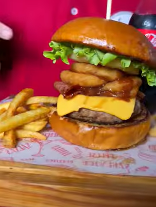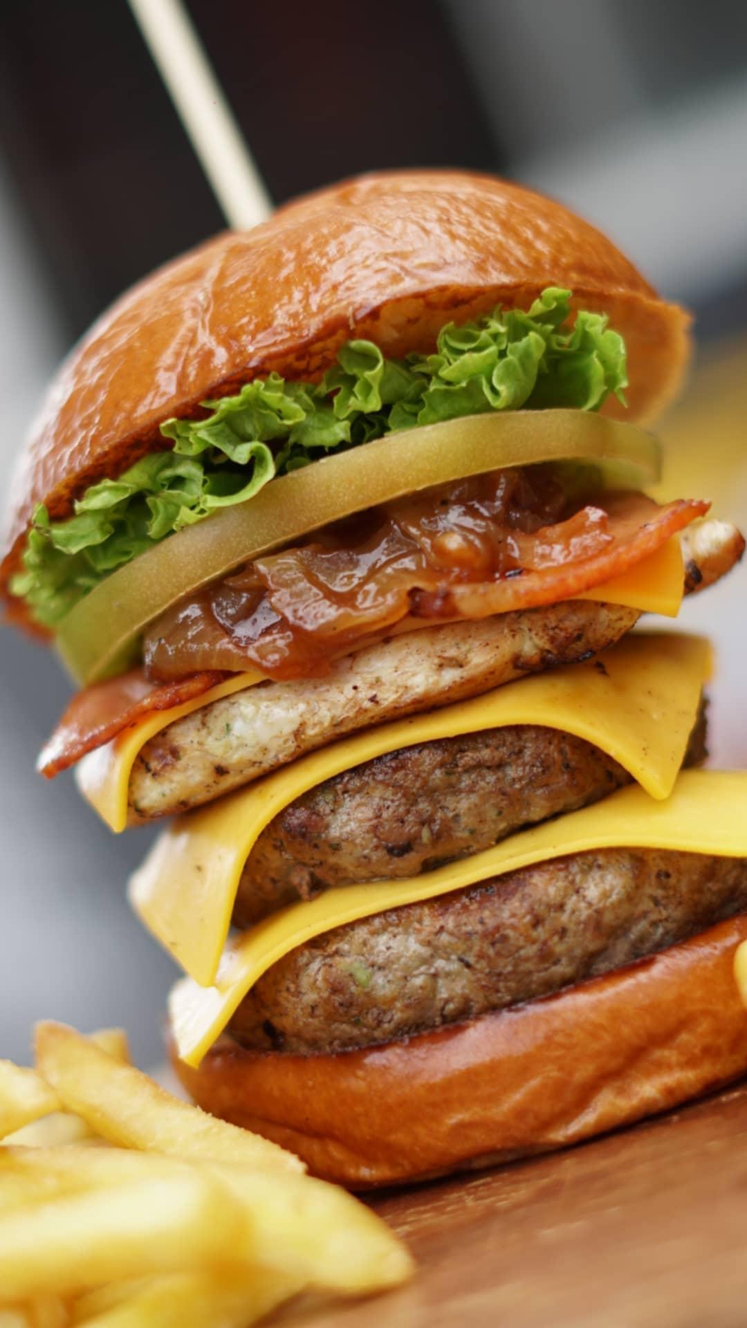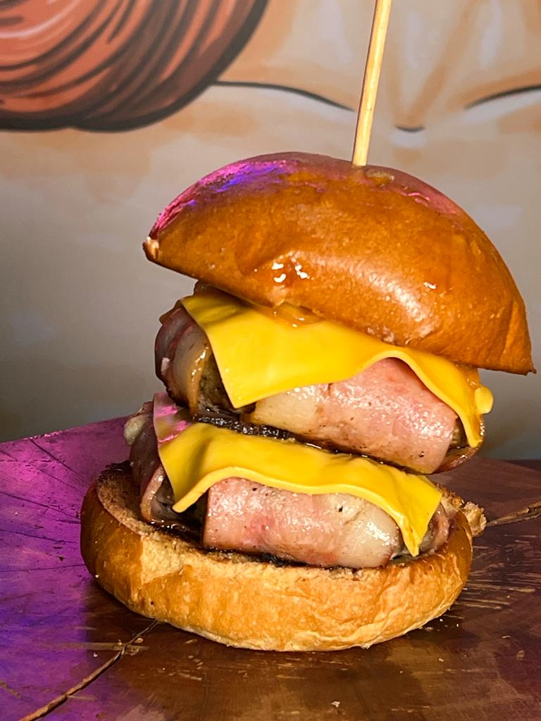 Pan brioche, 2 carnes de 125 g cada una, croqueta de pollo apanado, tocineta, cebolla salteada en BBQ y vegetales. Incluye papa frita.