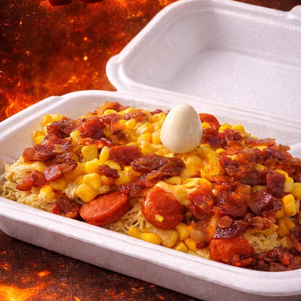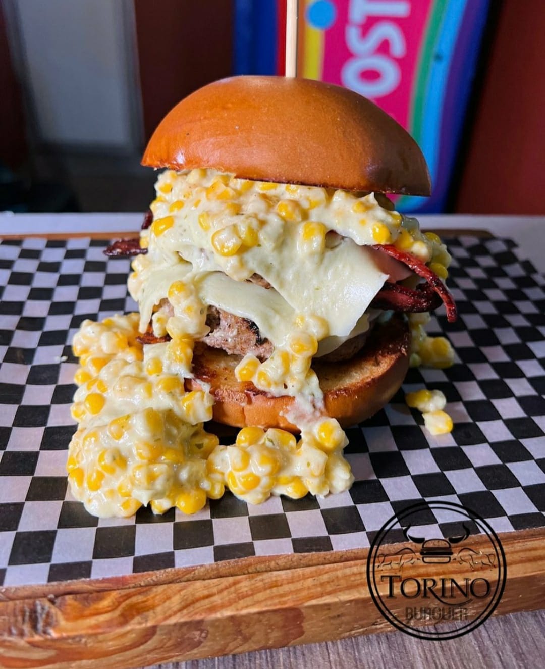 pan brioche, 2 carnes 125 gramos, doble tocineta, queso doble crema, maiz fundido en doble crema y doble crema