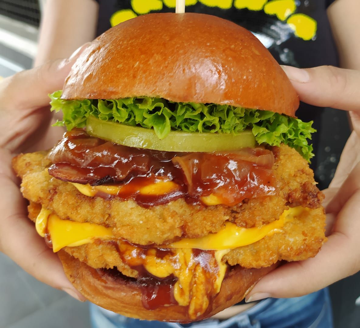 Pan brioche, doble filete de pechuga apanada, tocineta, queso cheddar y cebolla salteada en BBQ. Incluye papa frita.(100 gr papa criolla )