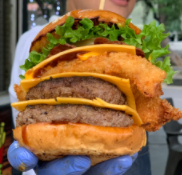 Pan brioche, carne de 150 gr, filete de pechuga apanado, tocineta, queso cheddar, cebolla caramelizada tímate y Lechuga incluye papas fritas