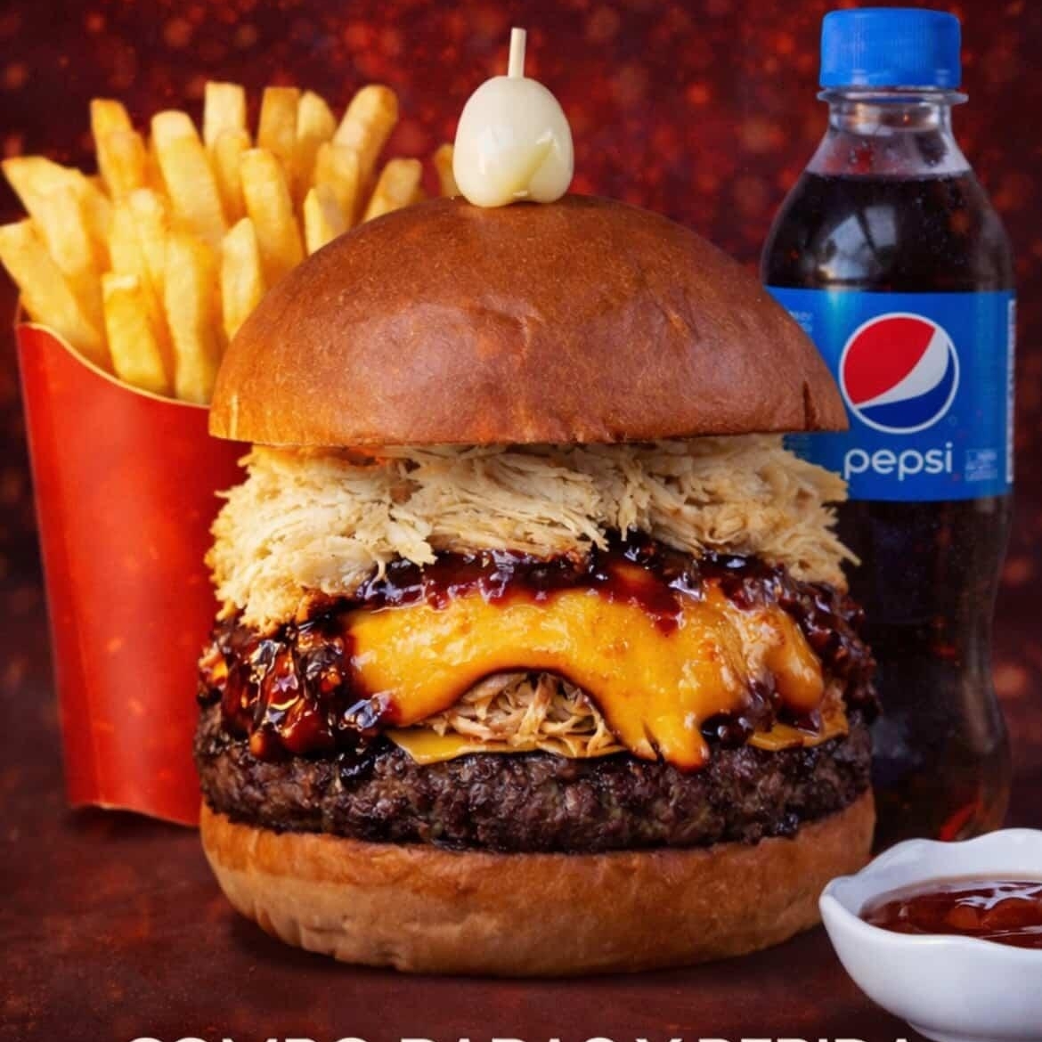 Hamburguesa Suprema con pan brioche, carne de res, queso cheddar, cebolla caramelizada BBQ y pollo desmechado y un huevo de codorniz. Incluye porción de papas fritas 🍟