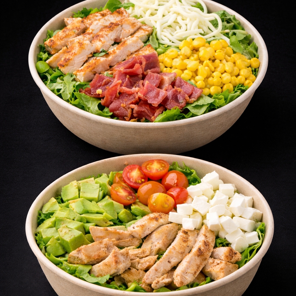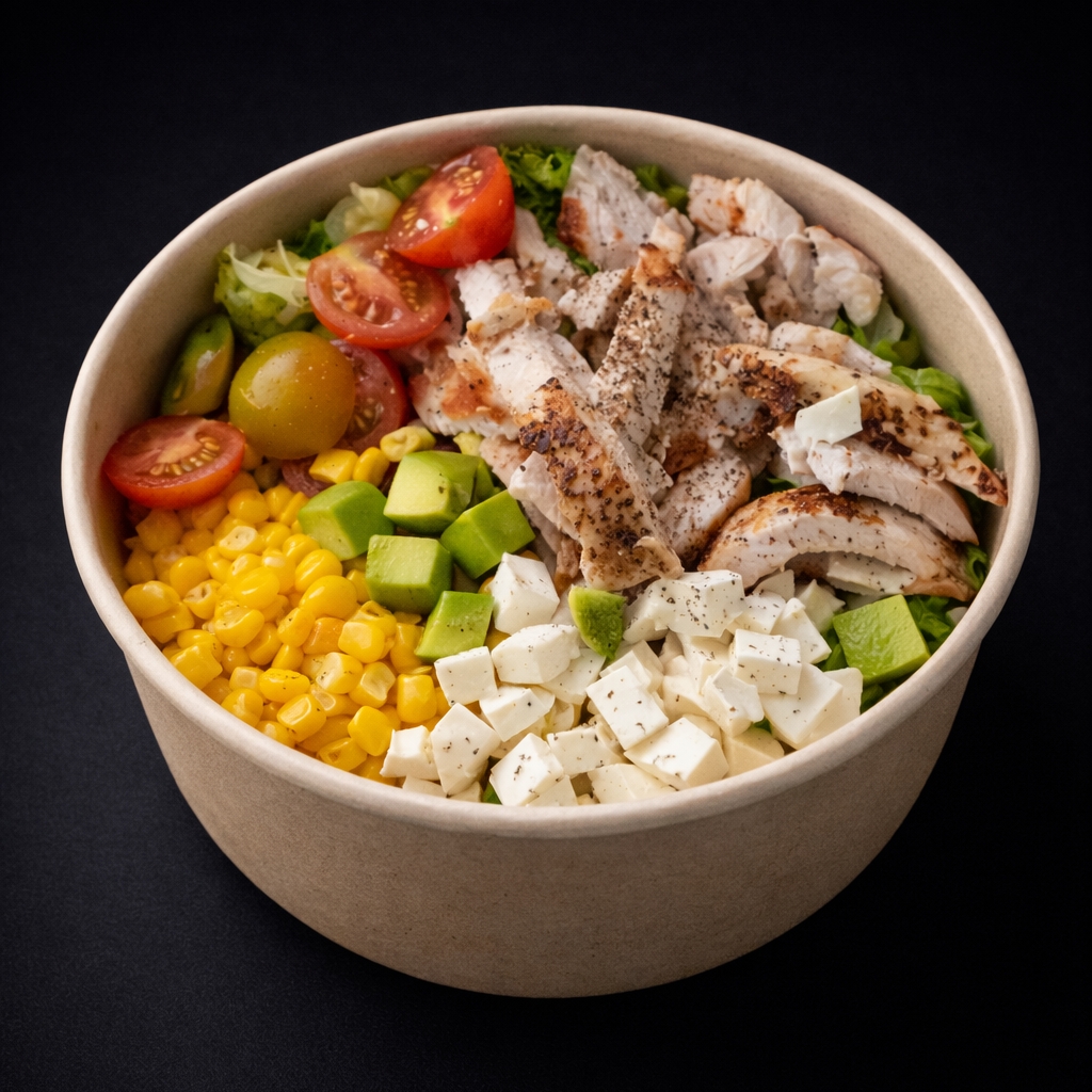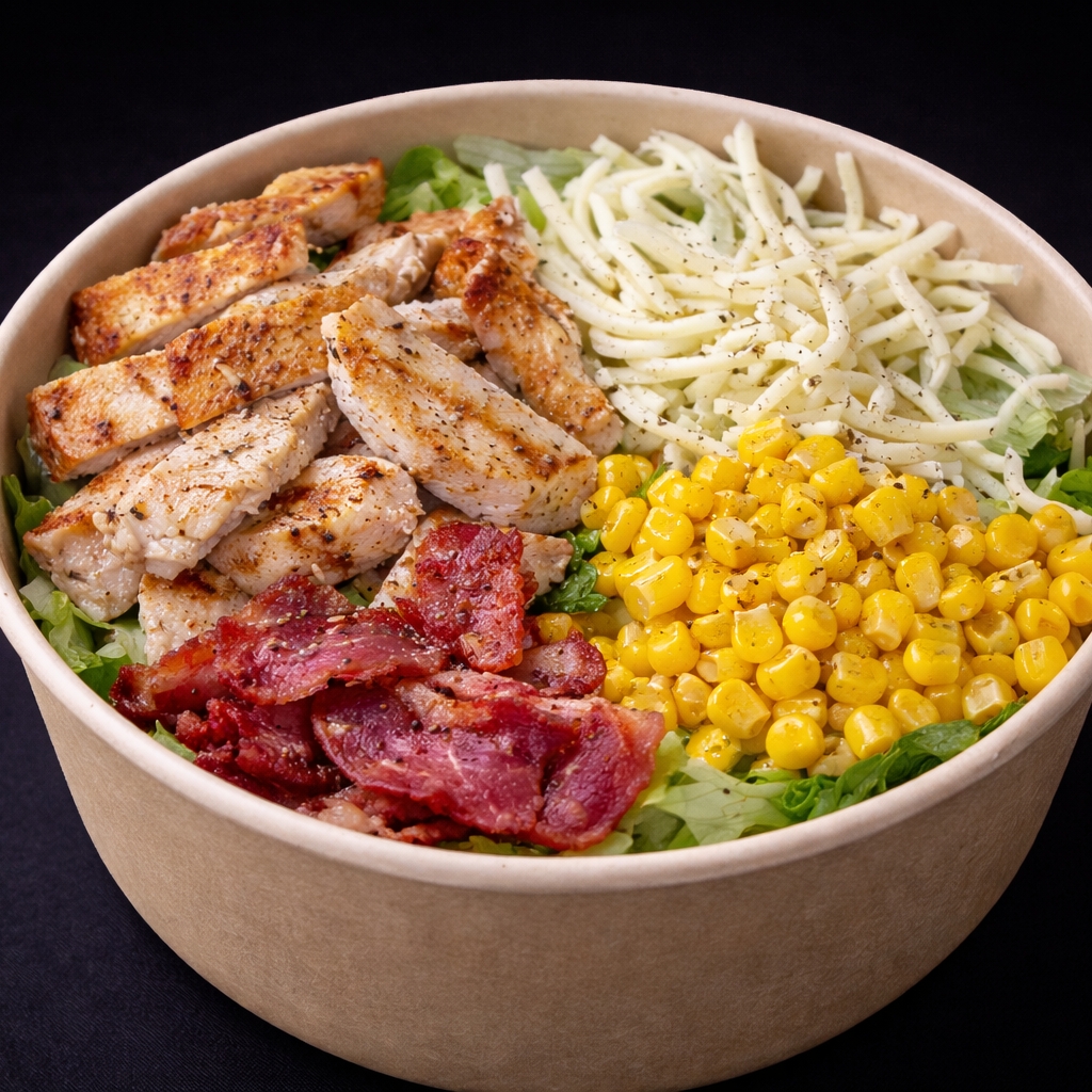 Lonjas de pollo asado en tiras, maíz tierno, tocineta crocante y queso mozzarella sobre mix de lechugas frescas, acompañada de vinagreta especial.