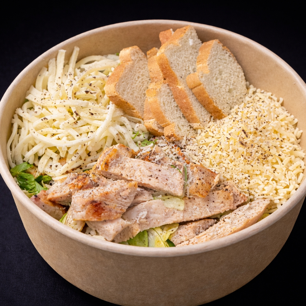 Pollo en tiras, crutones artesanales, queso parmesano y mozzarella sobre mix de lechugas frescas, acompañada de vinagreta clásica.