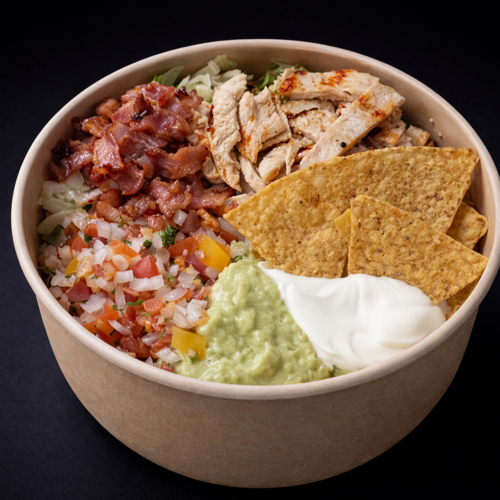 Pollo asado en tiras, tocineta, tortilla de maíz crocante, pico de gallo, guacamole y sour cream sobre mix de lechugas frescas.