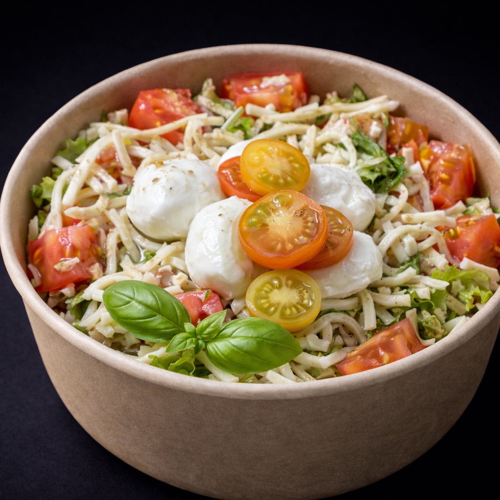 Tomates frescos seleccionados, queso de búfala y mozzarella, hojas de albahaca fresca sobre mix de lechugas crocantes, acompañada de vinagreta de casa.