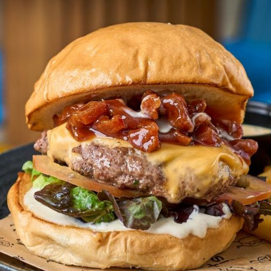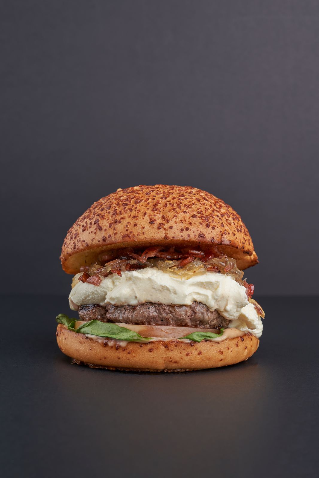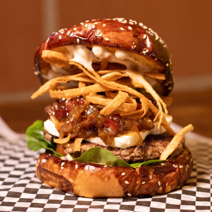 Pan parmesano, mayonesa de chipotle ahumada, carne de res, queso crema, mermelada de tocineta y vegetales.