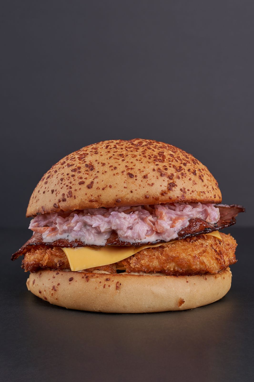 Pan parmesano, mayonesa 52 street, pollo apanado en panko, vegetales frescos, queso cheddar y tocineta.