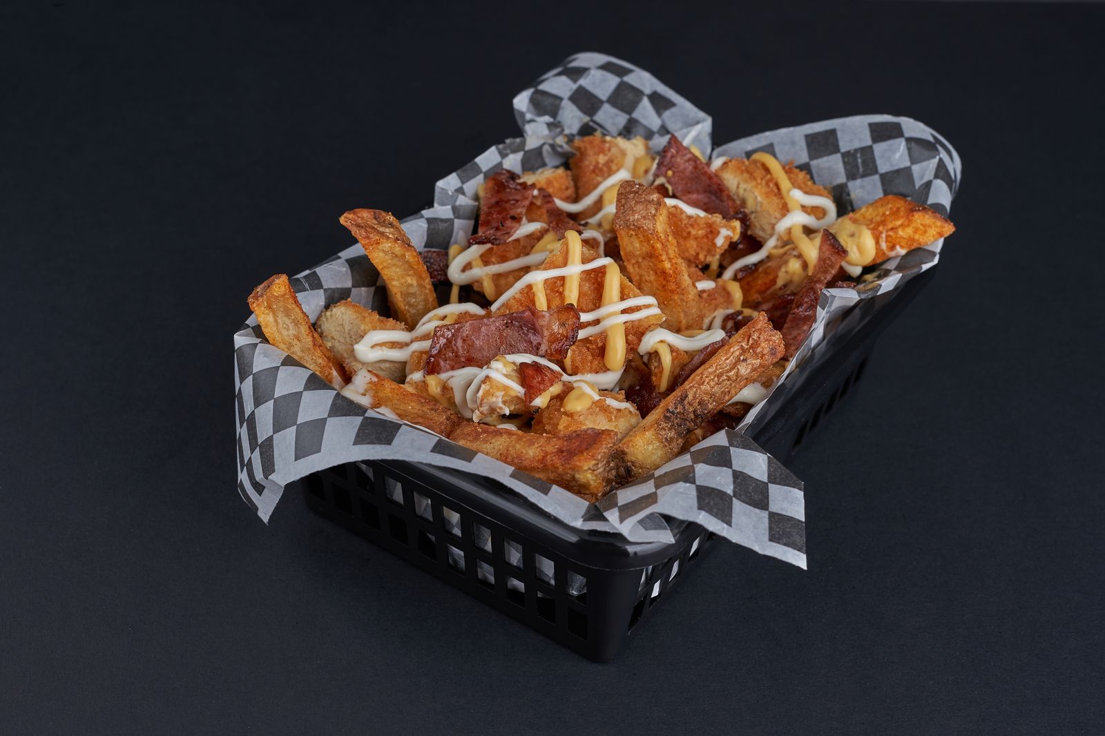 Papas a la francesa, crispetas de pollo, cebollas caramelizadas, salsa cheddar y sour cream.