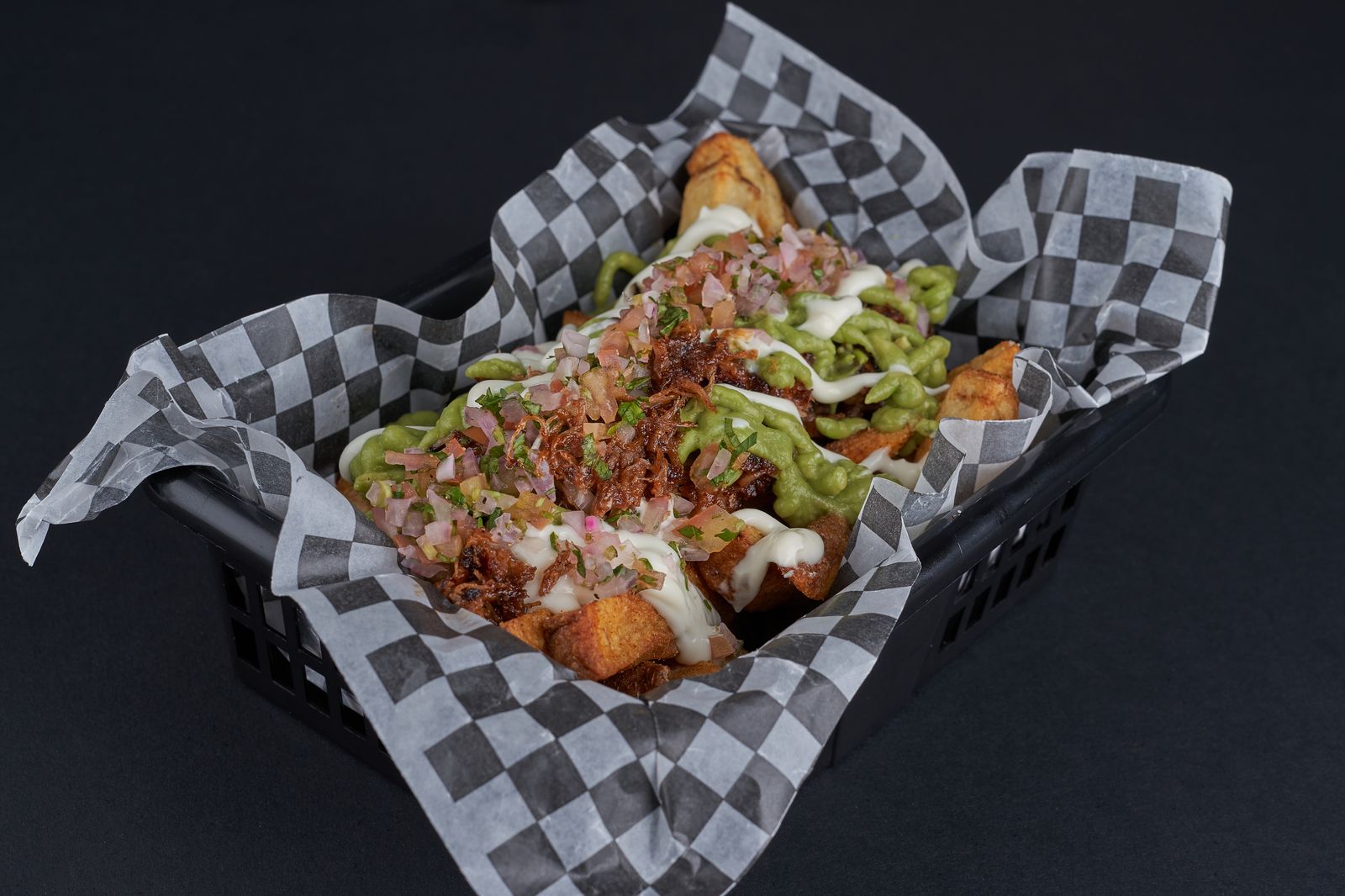 Papas a la francesa, pulled pork, pico de gallo y sour cream.
