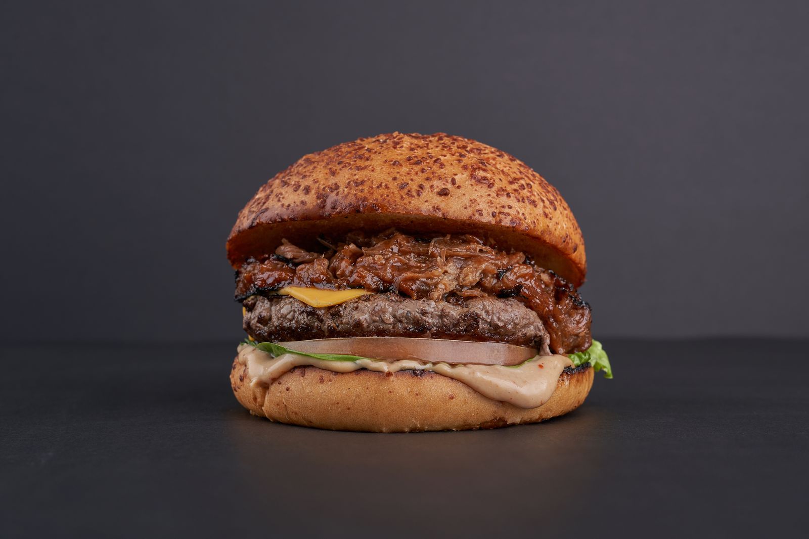 Pan parmesano, mayonesa de chipotle ahumada, carne de res, pulled pork en BBQ dulce, queso cheddar y vegetales frescos.
