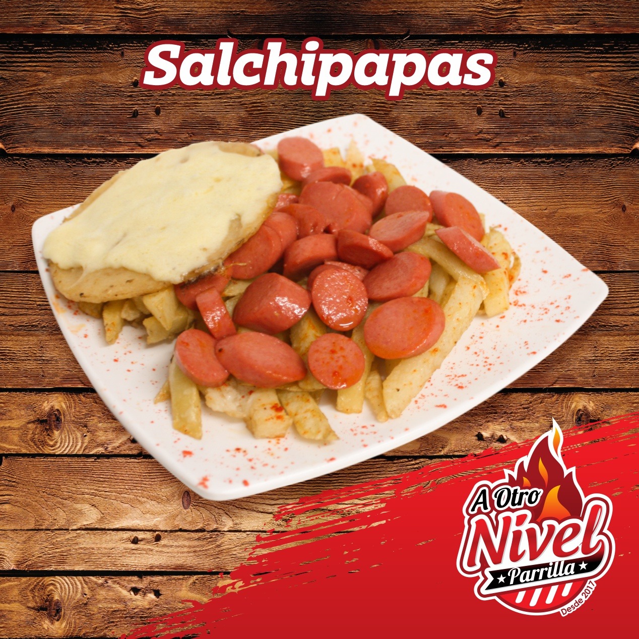 Papas a la francesa, chorizo, 1 huevito, arepa y porción de queso.