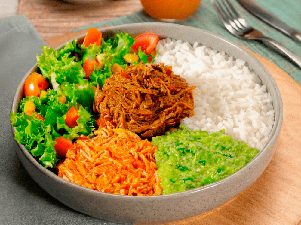 Elige dos proteínas en tu bowl, acompañado de ensalada fresca, guacamole y arroz.