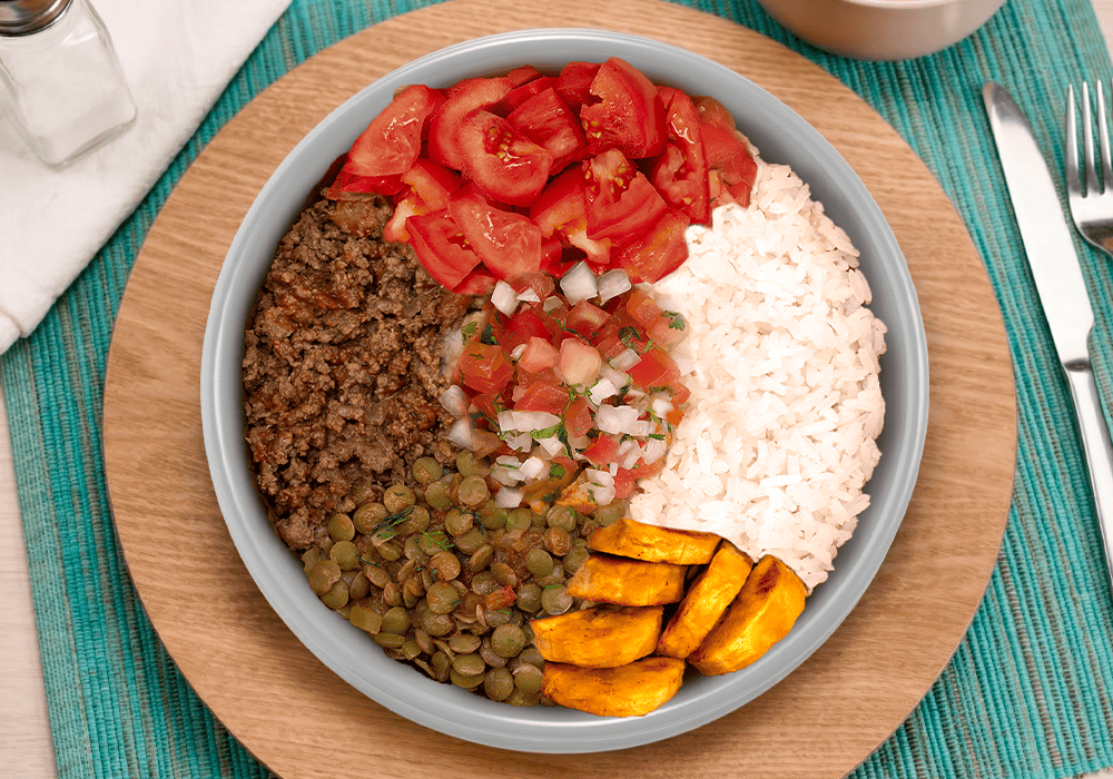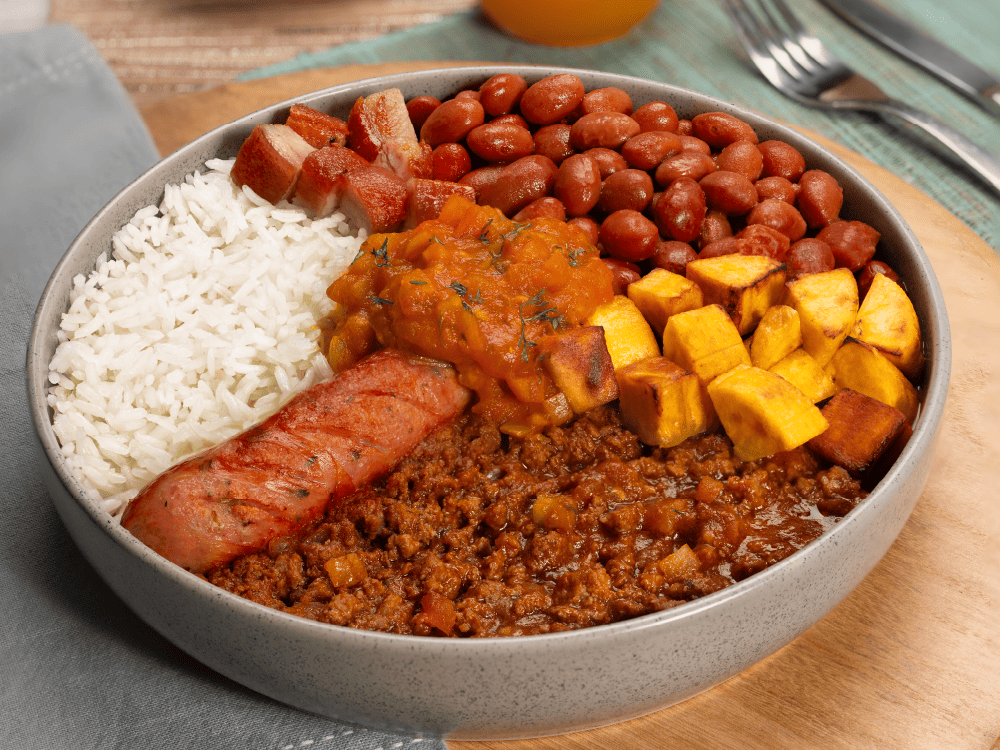 Bowl con más cantidad de proteína: Carne molida con hogao, chorizo y chicharroncitos acompañado de frijol rojo, arroz, maduro y hogao Peso aprox 900 gr