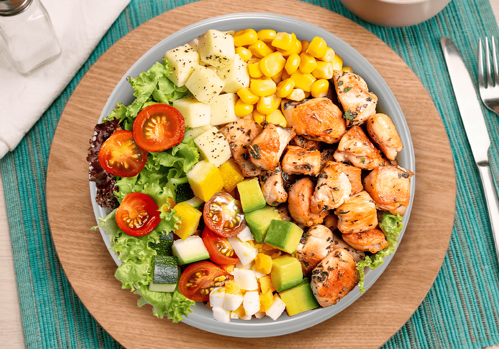 Bowl con porción extragrande de pollo finas hierbas, mozzarella, tomate cherry, aguacate, huevo, zucchini,maíz, base de lechuga y salsa de la casa. *Salsa de la casa: mayonesa de cilantro.