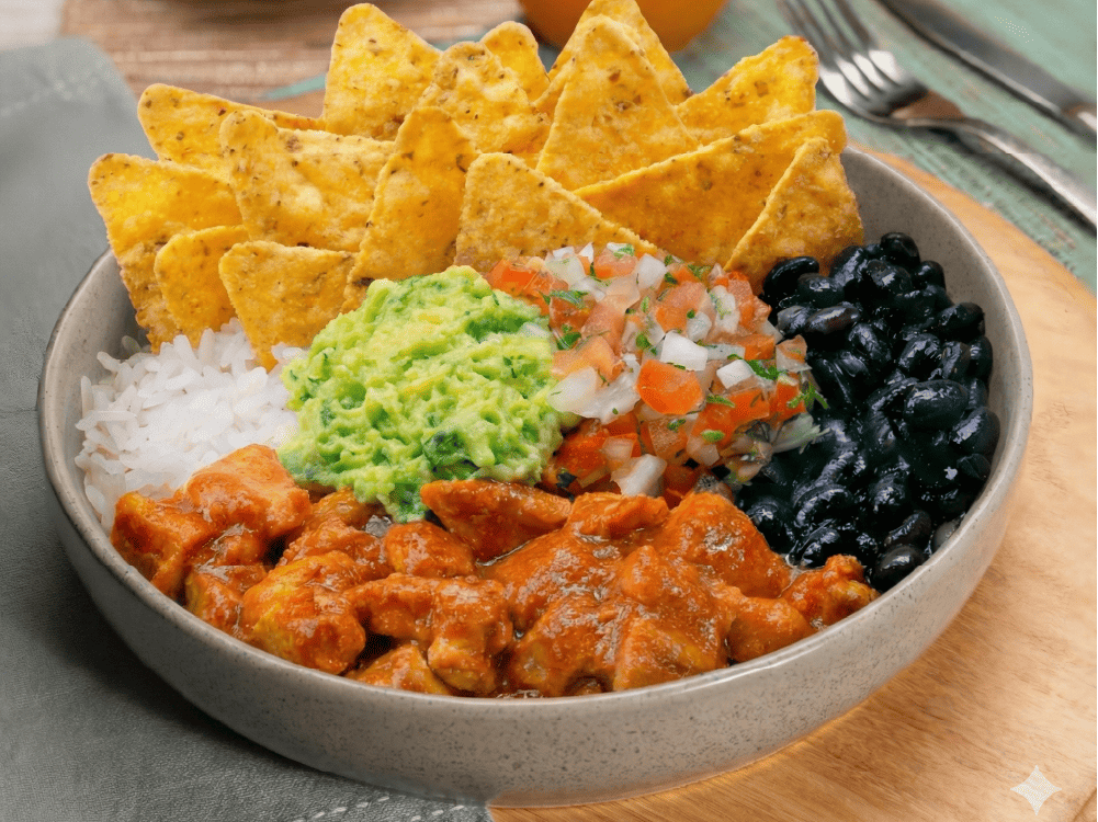 Bowl con porción extragrande de pollo en preparación mexicana (un poco picante), nachos, pico de gallo, guacamole,mozzarella,maíz, lechuga y salsa de la casa. *Salsa de la casa: mayonesa de cilantro.